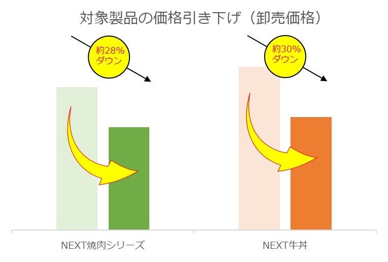 そのような中、当社ではこのたび、主力商品4つの卸売価格を引き下げます。NEXTカルビ1.1、NEXTハラミ1.1、NEXTカルビ2.0のNEXT焼肉シリーズは約28%の引き下げ、NEXT牛丼1.2は約30%の引き下げとなります。