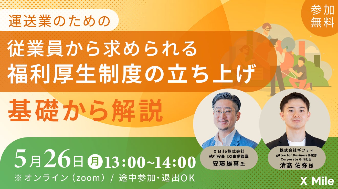 物流事業者向けSaaS・プラットフォーム「ロジポケ」を提供するX Mile株式会社(読み:クロスマイル、本社:東京都新宿区、代表取締役:野呂 寛之、以下「当社」)は、株式会社ギフティ(本社:東京都品川区、代表取締役:太田 睦、鈴木 達哉、以下「ギフティ」)と共同で、「運送業のための従業員から求められる福利厚生制度の立ち上げ基礎から解説セミナー」を実施することをお知らせいたします。