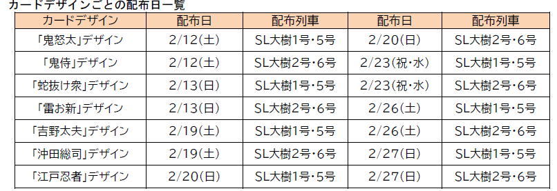 イベント実施日限定で、SL大樹にご乗車いただいたお客様全員に、本イベントに登場するキャラクターがデザインされた「SL大樹珍道中オリジナルカード」(全7種)を1枚配布します。