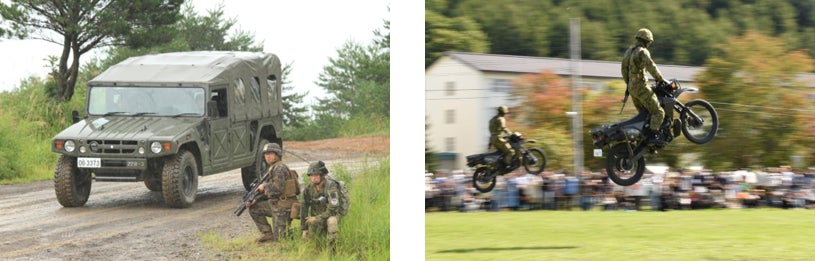 ・高機動車・偵察用オートバイの展示。実際に乗って写真撮影もできます!