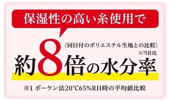 保湿性の高い糸を使用し、通常のポリエステル生地より約 8倍の水分率があるしっとりした肌触りの商品です。