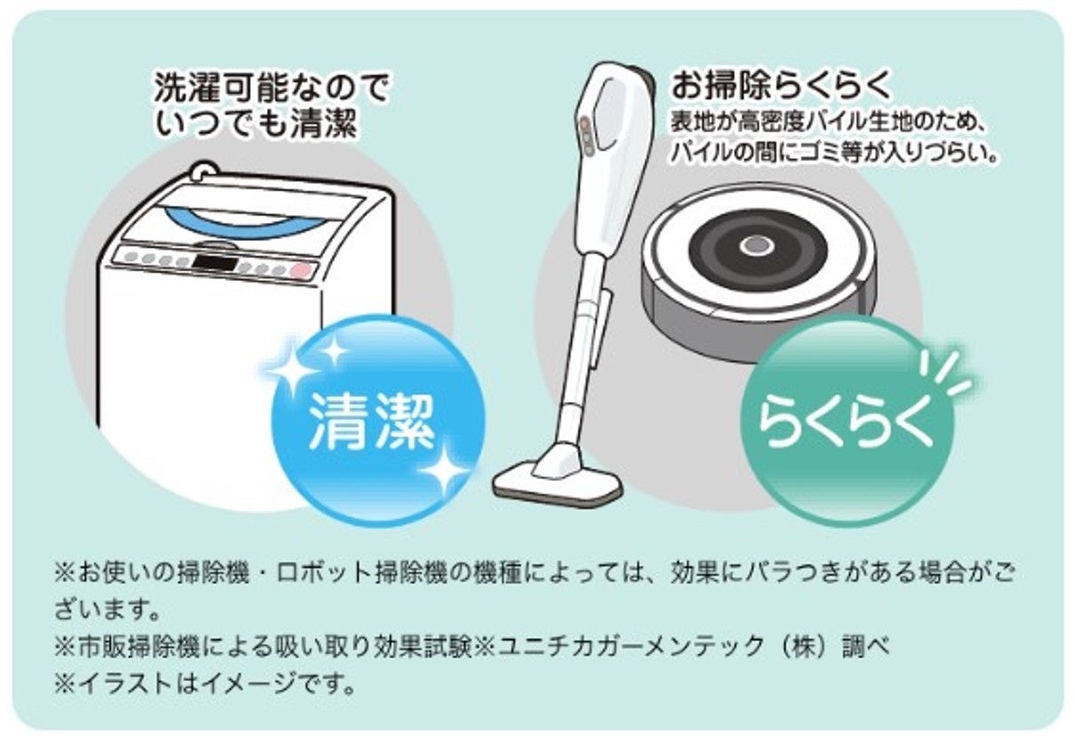 汚れても洗濯機で洗えて、タンブル乾燥もできる商品です。 表地の毛足を短く高密度にすることで、ゴミが入りこみにくく掃除しやすい仕様になっています。 今年は新たに制菌加工を施し清潔性を強化しました。