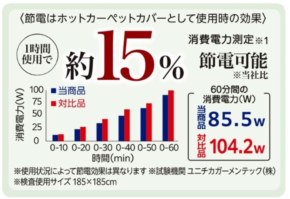 ホットカーペットカバーとして使用した時の通常商品と比較したときの節電効果について、昨年は10%の効果でしたが今年は15%にアップしています。 裏面のメッシュ構造が床とラグとの間に空気層を作り出し、熱を逃がしにくくなっています。