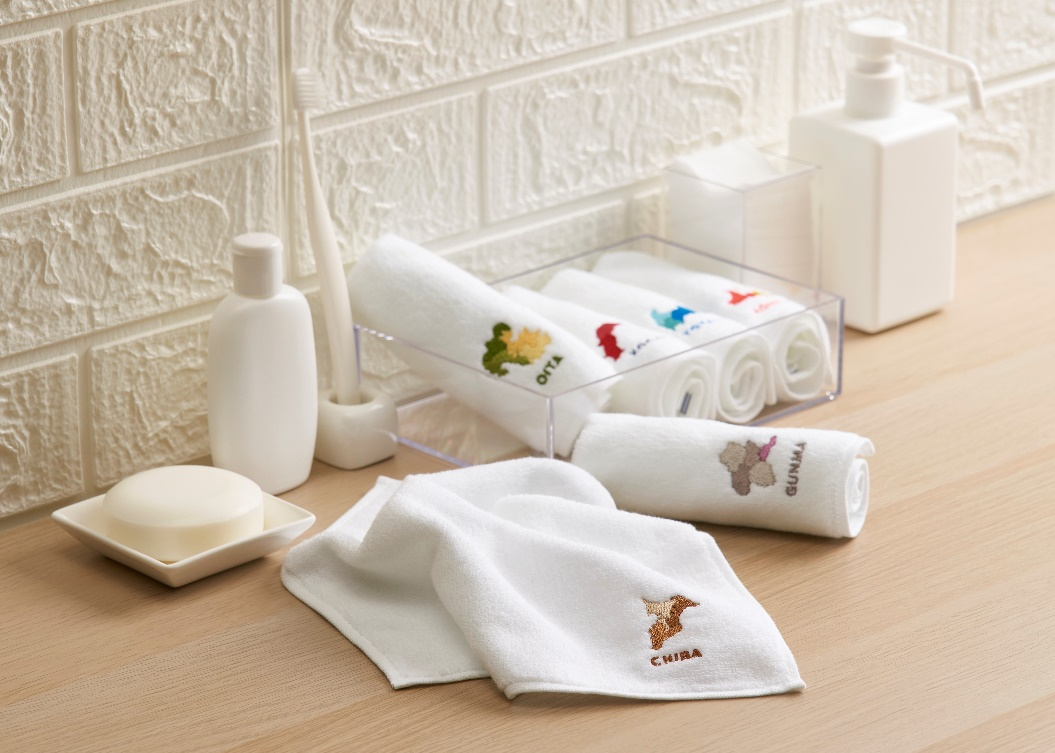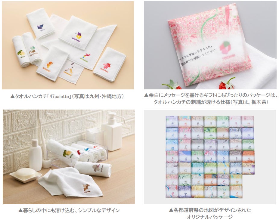 タオルハンカチ「47palette」は、47都道府県それぞれの形を、北海道は「ラベンダー」、栃木県は「いちご」、愛知県は「しゃちほこ」のように、名産品や名所などをイメージした色のワンポイントの刺繍で、彩り豊かに表現したアイテムです。