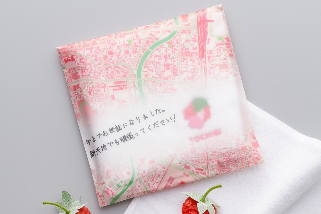 商品パッケージは、地図をあしらったデザインに加え、タオルハンカチの刺繍が透けて見えるこだわりの仕様です。