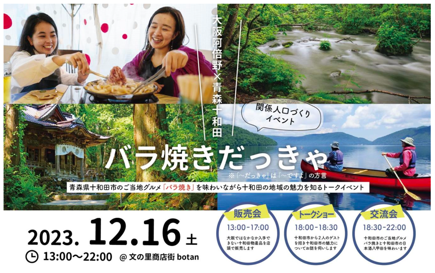 一般社団法人 十和田奥入瀬観光機構はこの度、都市とローカルのマッチングサービス「ふるシェア」を提供するふるさとシェアリング株式会社(本社:大阪市阿倍野区、代表取締役:小田切聡)が主催するイベント、「大阪阿倍野×青森十和田 バラ焼きだっきゃ」に参加致します。
