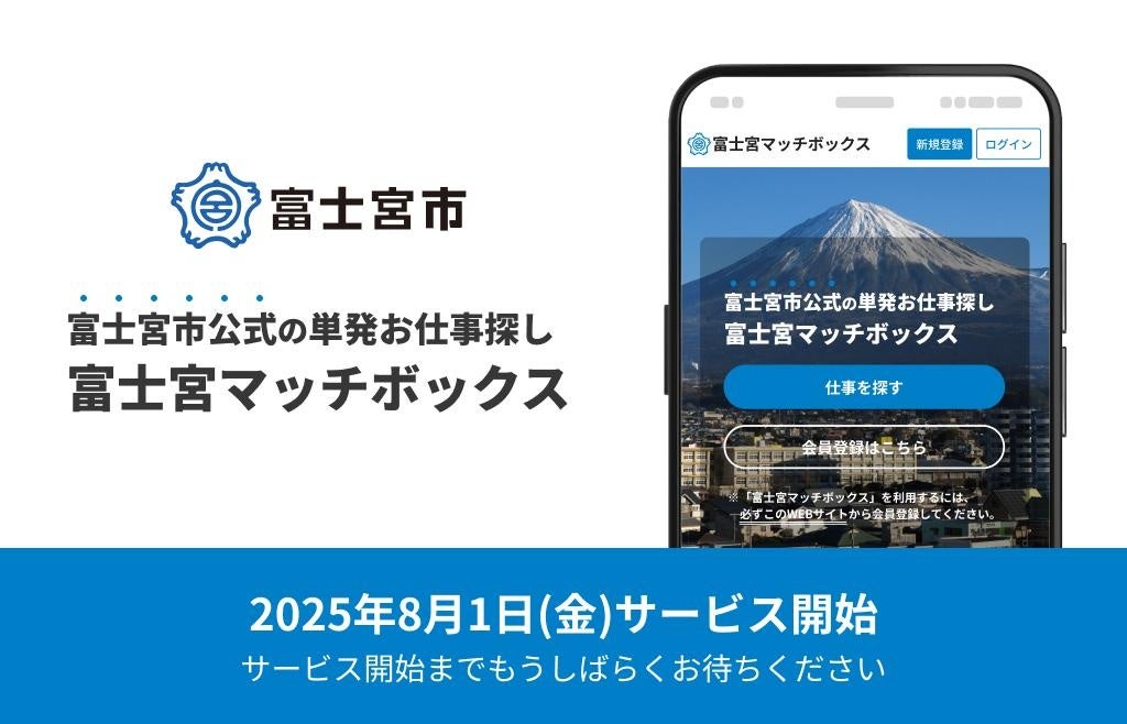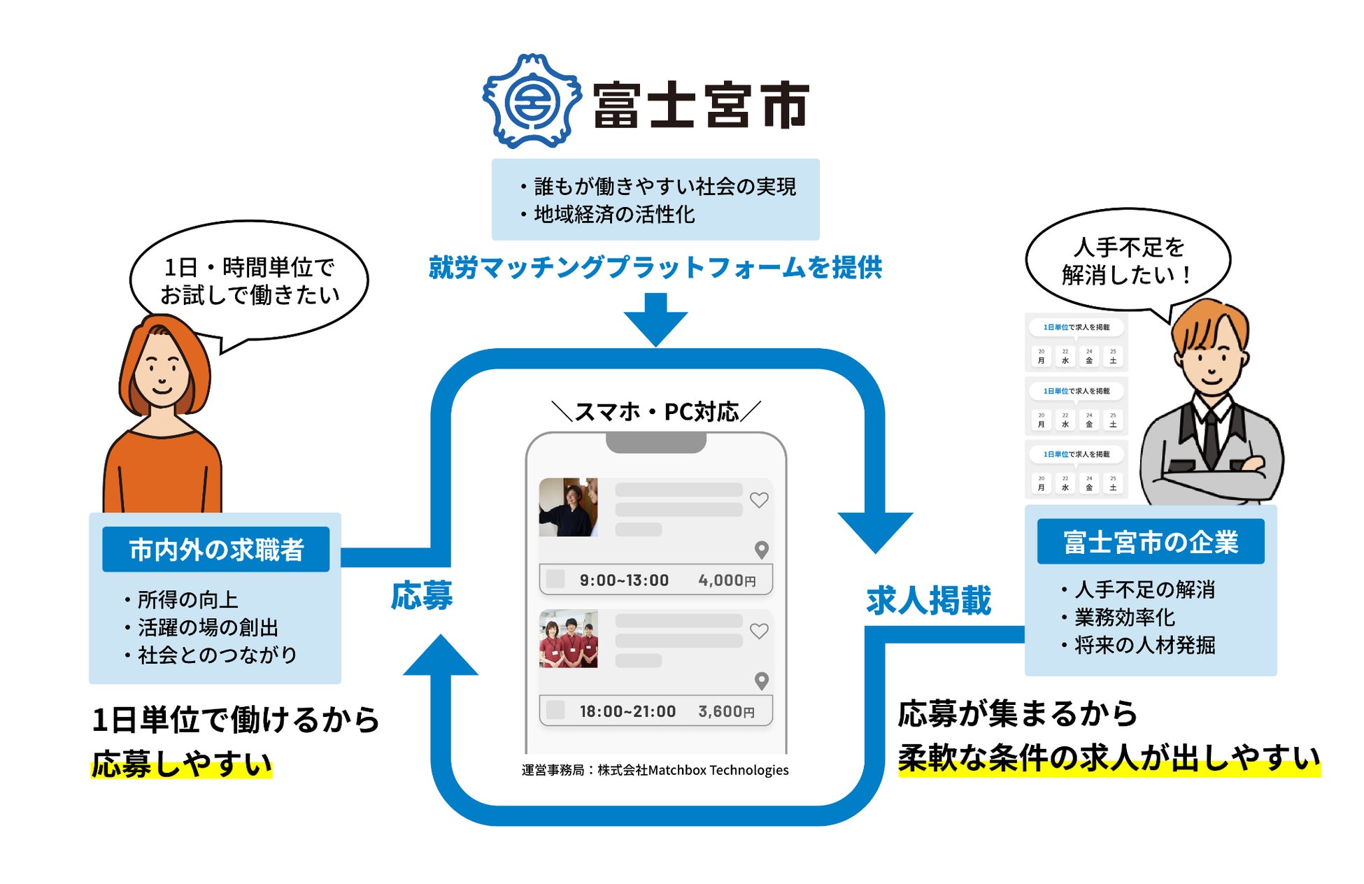 当社は1日・数時間単位の求人と働き手をオンラインでマッチングする自治体公式就業プラットフォーム「自治体公式マッチボックス( https://business.matchbox.jp/government )」の構築・運用をサポートしています。富士宮市が開設する「富士宮マッチボックス」では、利用企業が富士宮市を就業地とした求⼈を無料で掲載でき、Webサイトおよびアプリケーション上に集約された求人には、富士宮市内の求職者を中心に全国から閲覧・応募が可能です。