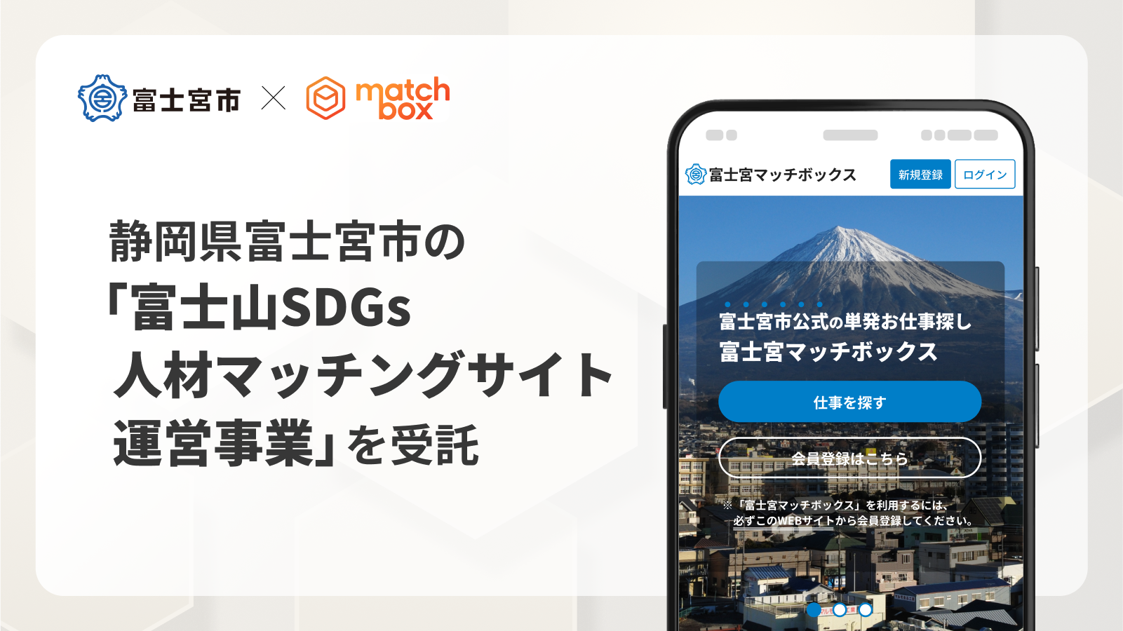 株式会社Matchbox Technologies(マッチボックステクノロジーズ、本社:新潟県新潟市中央区、代表取締役社⻑:佐藤 洋彰、以下当社)は、この度、静岡県富士宮市(市長:須藤秀忠 すどう ひでただ)より「富士山SDGs人材マッチングサイト運営事業」を受託しました。富士宮市は、市公式の人材マッチングサイト「富士宮マッチボックス」を開設し、8月1日(金)よりサービスを開始いたします。また、サービス開始に先駆け、7月2日(水)~4日(金)に、富士宮市内の事業者向け説明会を開催いたします。