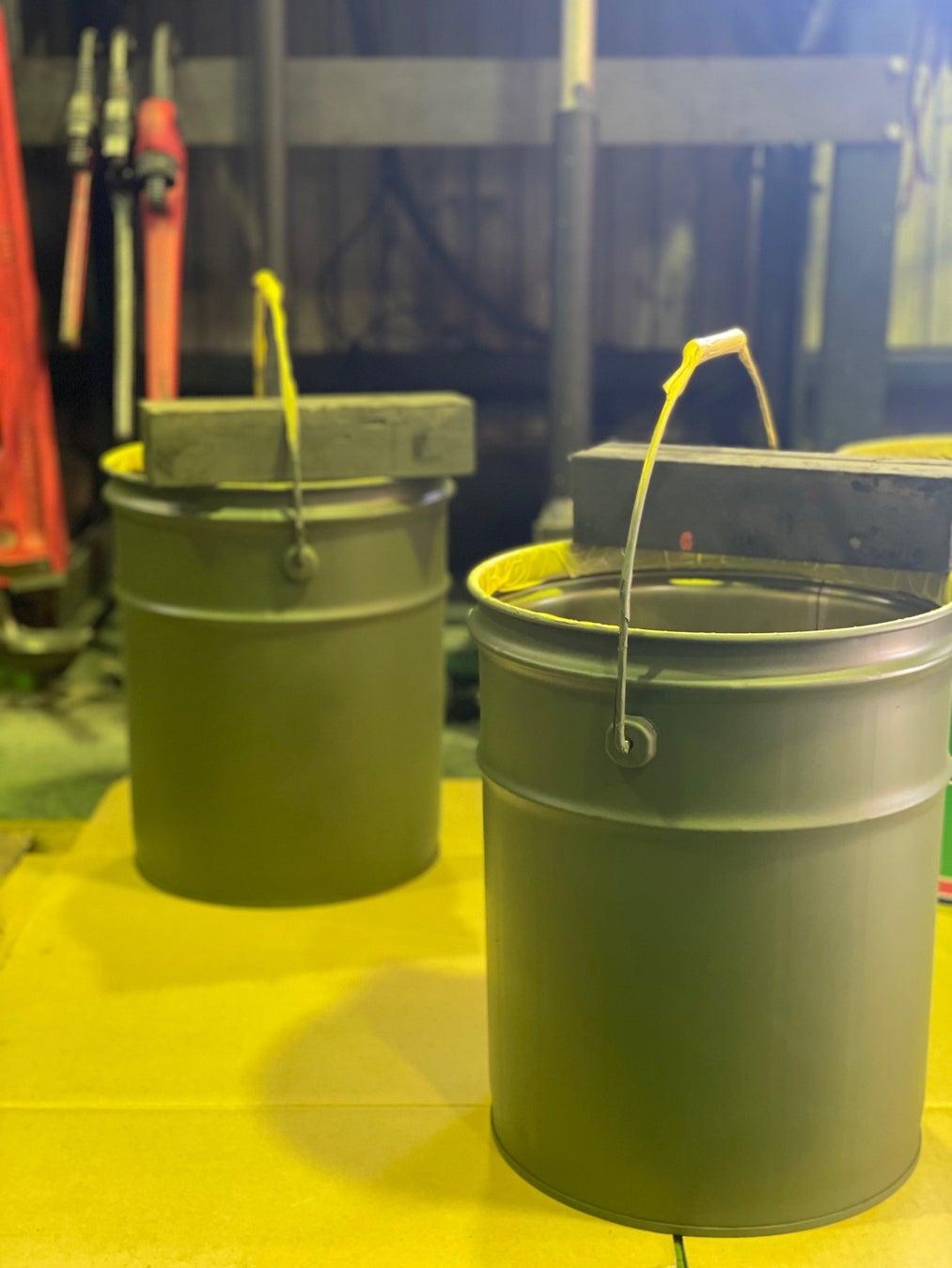 フォークリフトで使用したオイルの缶を、フォークリフトの塗料をペイントし再利用した商品「いす缶」です。