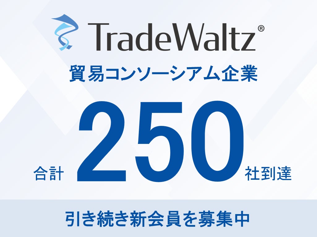 貿易情報連携プラットフォーム「TradeWaltz®︎」を運営する株式会社トレードワルツ(以下:トレードワルツ)が事務局を務める「貿易情報連携効率化・普及に向けたコンソーシアム」(通称:貿易コンソーシアム)の会員企業数が、2024年1月10日に250社へ到達したことをご報告いたします。