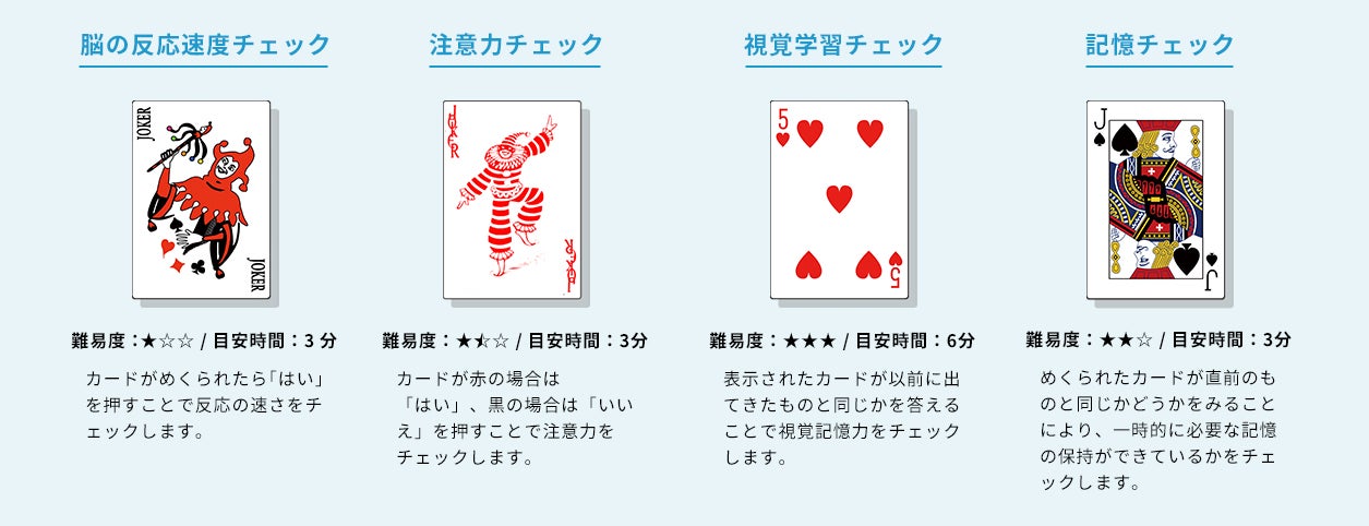 お手持ちのPCやタブレット、スマートフォン上でトランプカードを使った4つのテストを行い、脳の反応速度、注意力、視覚学習および記憶力をチェックすることができます。また、テスト結果では同年齢の平均と比べた、脳の健康度を確認できます。定期的にチェックすることで、お客さまの脳の健康意識を高めることを目的としています。疾病の予防や診断を目的としたものではありません。