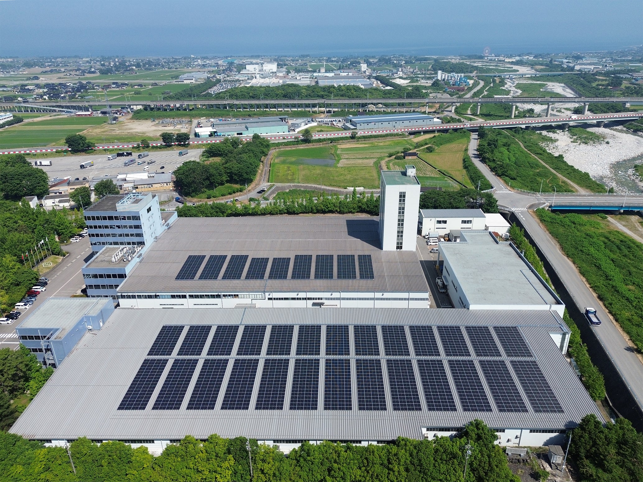 北陸電力グループの北陸電力ビズ・エナジーソリューション(株)が太陽光発電設備の設置、電力供給を行う「第3者所有モデル(PPA*)」のサービスを活用し、発電した電力は本社・早月事業所で自家消費します。