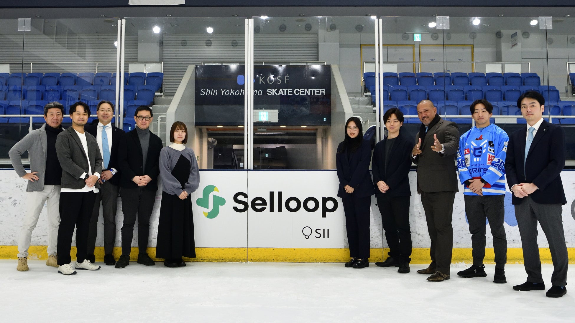 「Selloop」ロゴを背景に石井秀人選手(右から2番目)と記念撮影