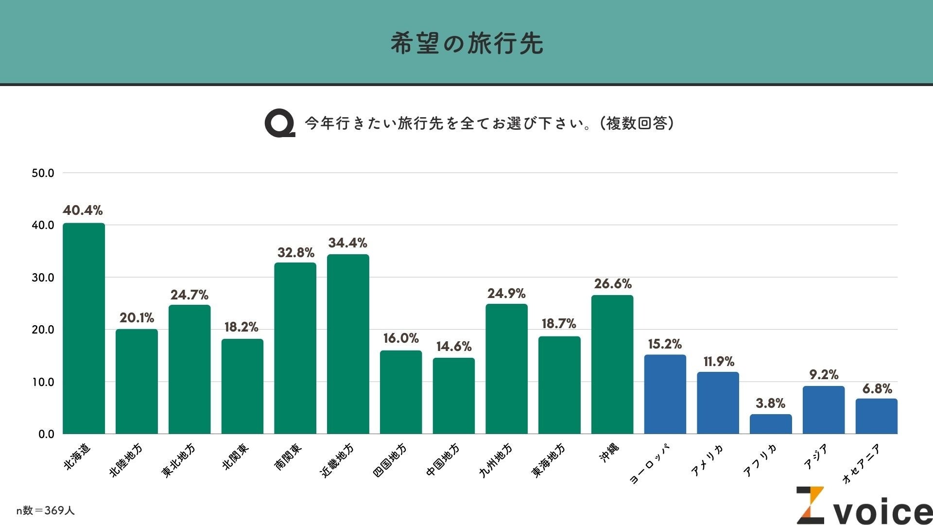 上記の質問を踏まえ、旅行を「前向きに検討をしている」と答えた369人に対して行きたい旅行先を聞いたところ、トップは「北海道」で40.4%という結果になりました。
