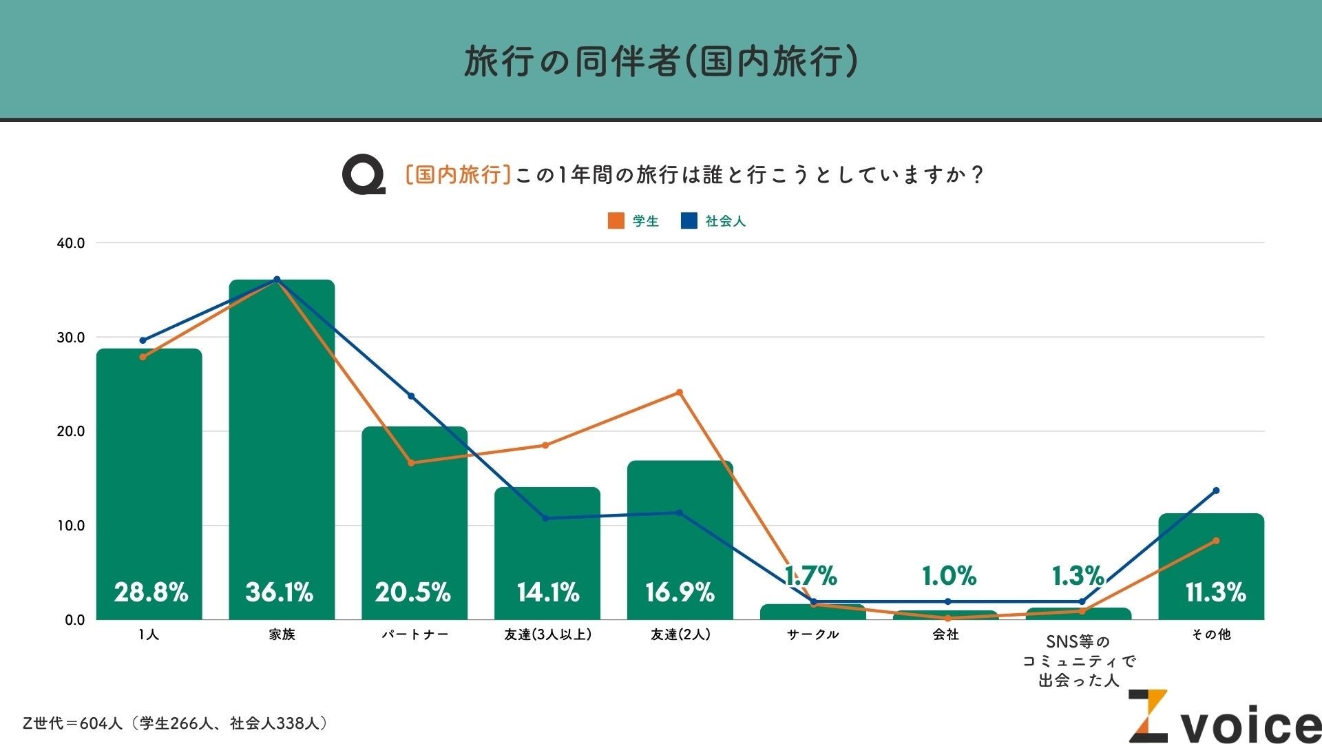 さらに、「学生」と「社会人」に分けて分析すると、学生は友達と、社会人はパートナーと行くと答えた割合が高い傾向にありました。