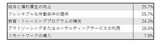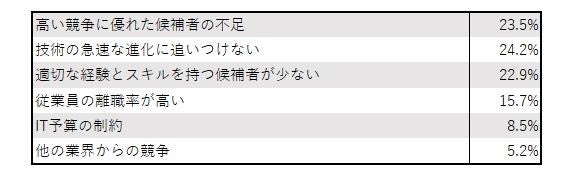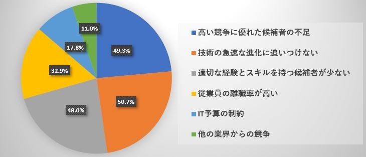 IT人材不足の原因の半数以上を、「候補者の不足」、「技術の進化に追いつけない」、「スキルを持つ候補者がいない」が占めています。IT分野における競争激化と技術の急速な変化に対応し、優秀なIT人材を確保・育成するために、企業は継続的な努力が必要であり、従業員の離職率を低く保つことが成功につながる要因の一つであることが示唆されています。