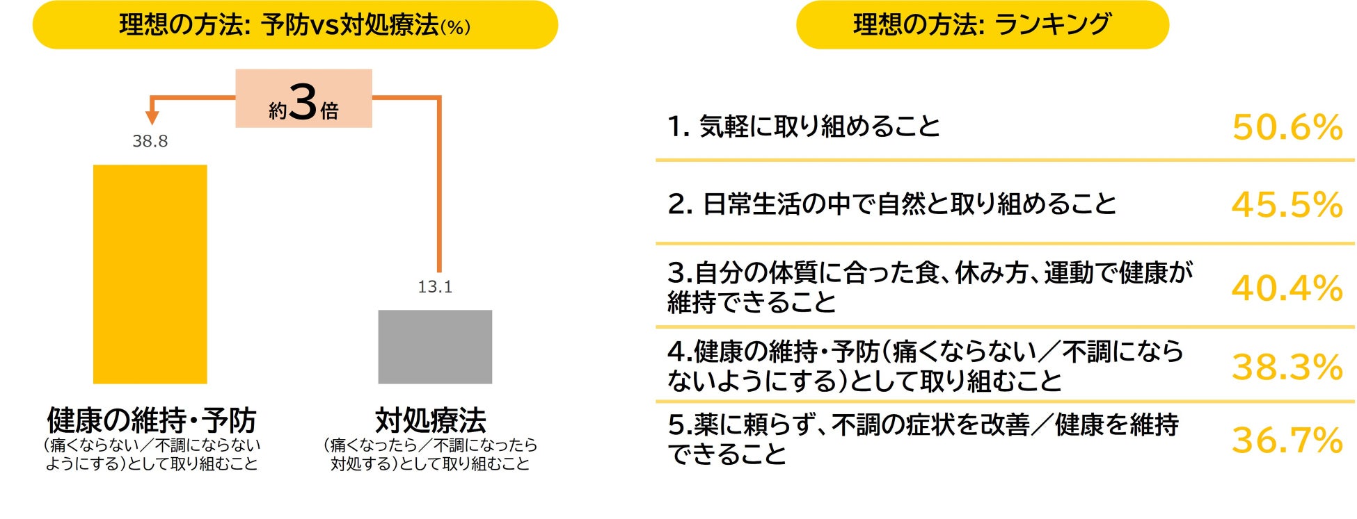 理想のセルフケアについて尋ねたところ、「気軽に取り組めること」(50.6%)が最も多い結果となりました。また、「対処療法」と「健康の維持・予防」で比較したところ、「健康の維持・予防」が“理想のセルフケア”と感じている人は「対処療法」よりも約3倍にのぼりました。この結果から、生活者の求める理想のセルフケアには“養生(※)”的な考えが含まれていることが分かります。