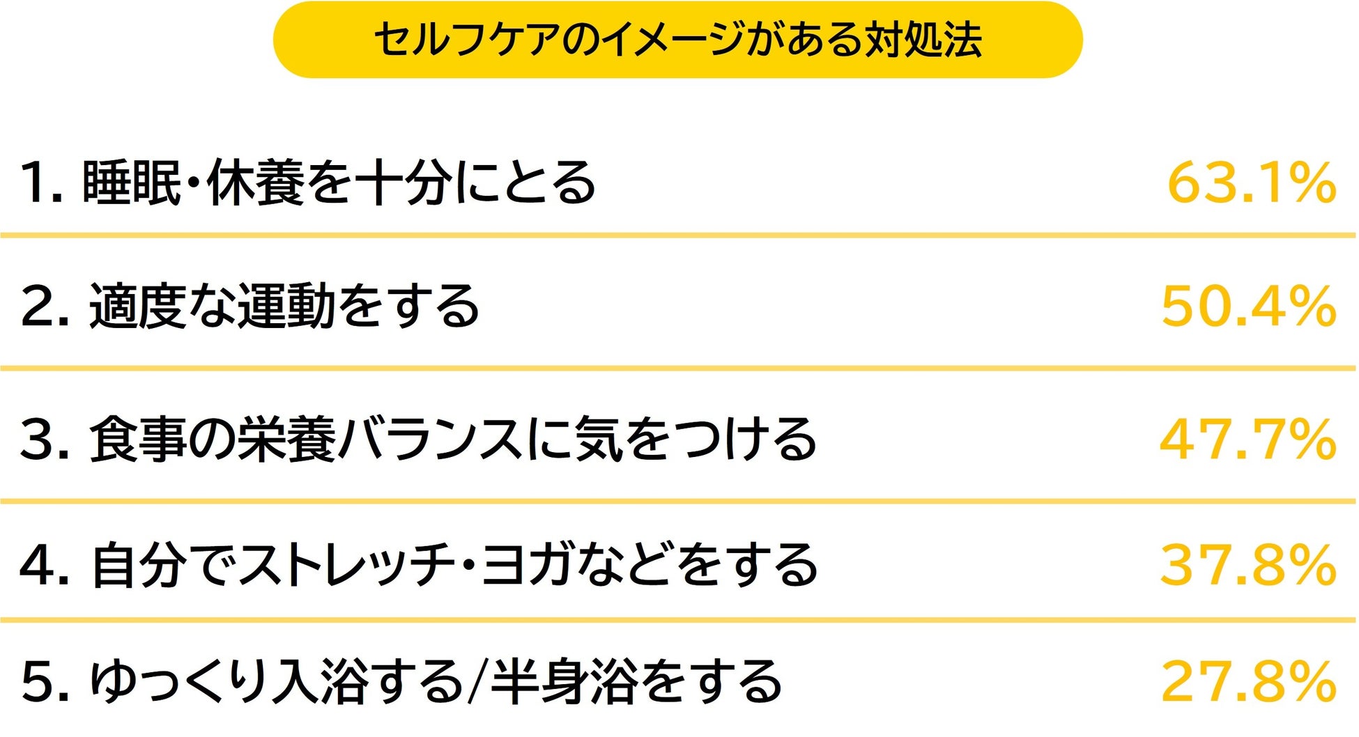 続いて、セルフケアでイメージする対処法について尋ねたところ、「睡眠・休養を十分にとる」が63.1%と最も多く、次いで「適度な運動をする」(50.4%)と「食事の栄養バランスに気をつける」(47.7%)が上位に入る結果となりました。生活者の多くは睡眠・運動・食事といった“取り組みやすい生活習慣”をセルフケアとしてイメージしていることが分かります。
