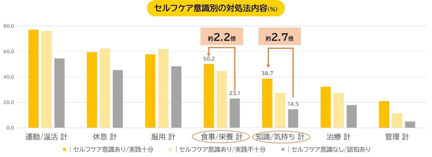 続いて、セルフケア意識の高低で対処法の内容を比較したところ、「食事/栄養」では意識ありと意識なしの間で約2.2倍、「知識/気持ち」へのケアにおいては約2.7倍の差がみられました。