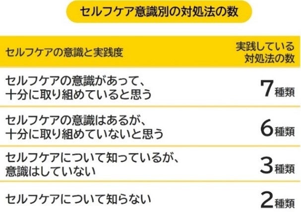 さらに、セルフケアの意識と実践度別に対処法の数を比較したところ、意識と実践度が高い人は、対処法の数も多いことも分かりました。