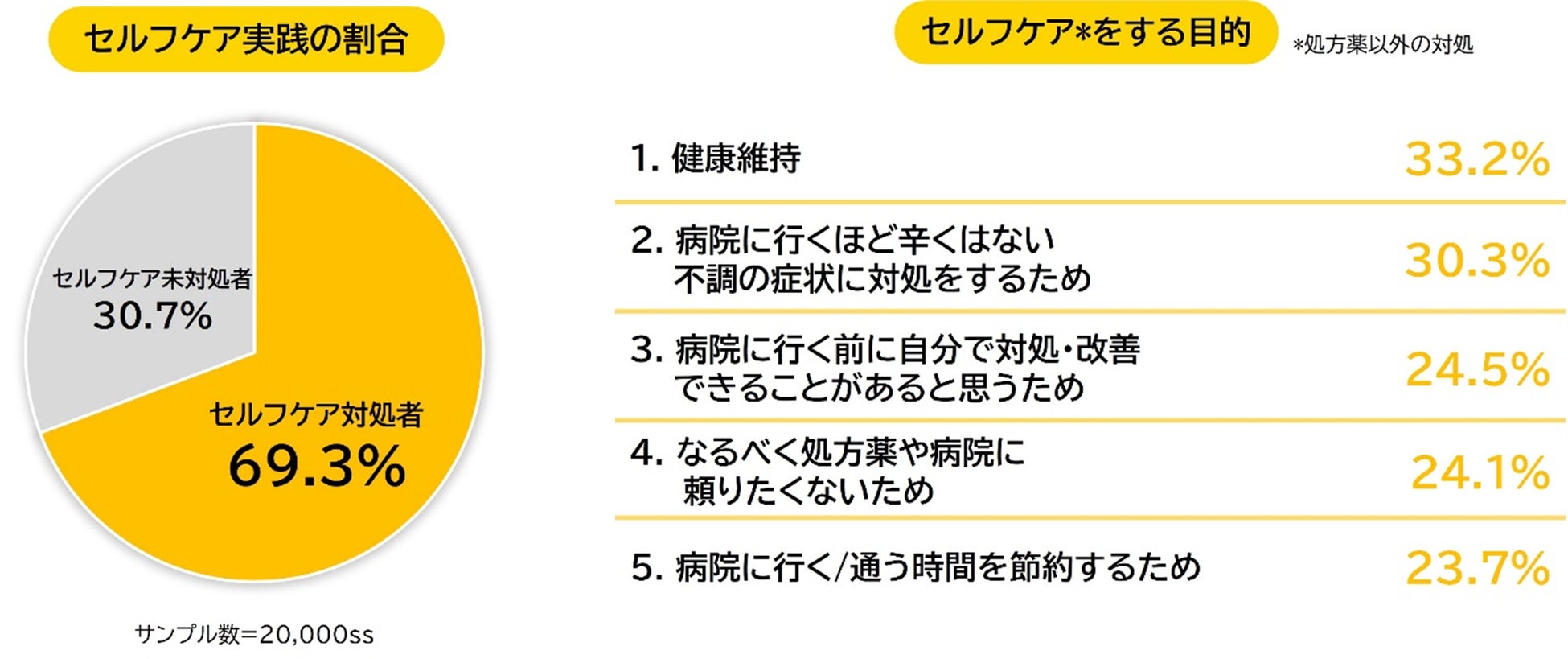 20代~60代の男女に、不調を感じたときに自分で対処する「セルフケア」を実践しているか尋ねたところ、69.3%の方が「セルフケア」を実践していると回答しました。また、セルフケアの目的は「健康維持」が33.2%と最も多い結果となりました。5位には「病院に行く/通う時間を節約するため」(23.7%)が入り、セルフケアに対するタイパ意識もうかがえます。