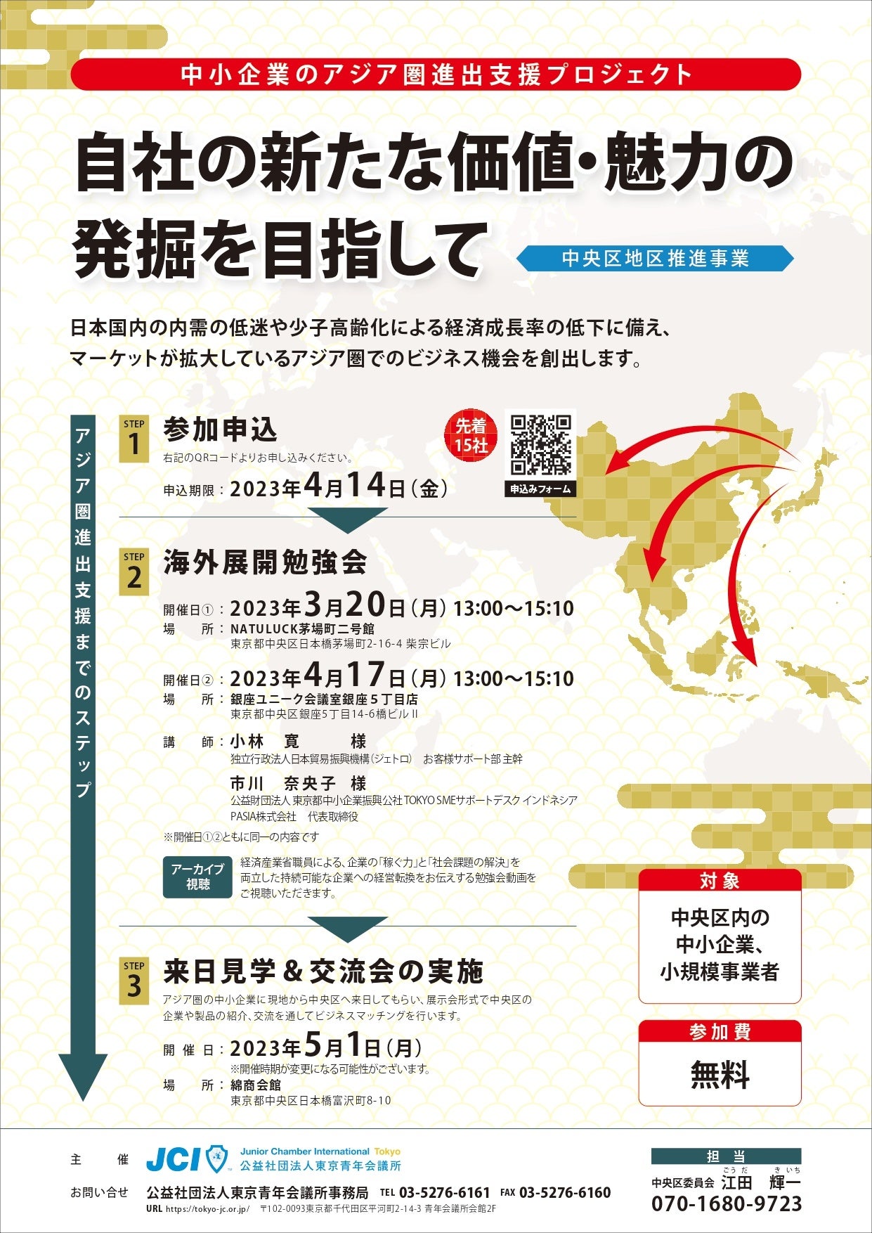 公益社団法人東京青年会議所 中央区委員会(所在地:東京都千代田区平河町、理事長:下山田 敬介)は、2023年3月より「中小企業のアジア圏進出プロジェクト」を実施いたします。