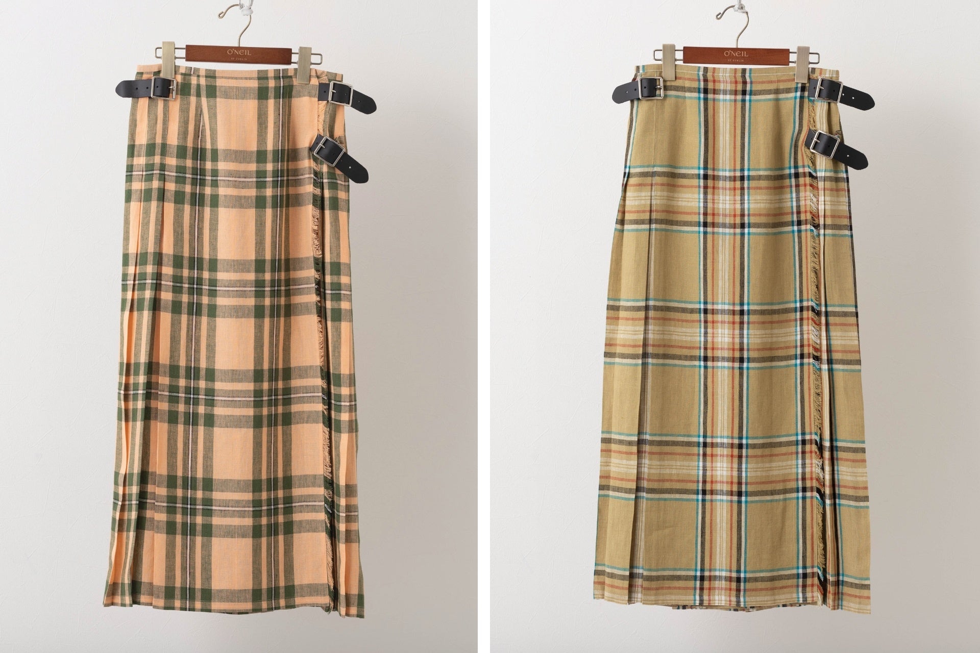ベルトで留めて着る、 時代に左右されないクラシカルなキルトスカートより