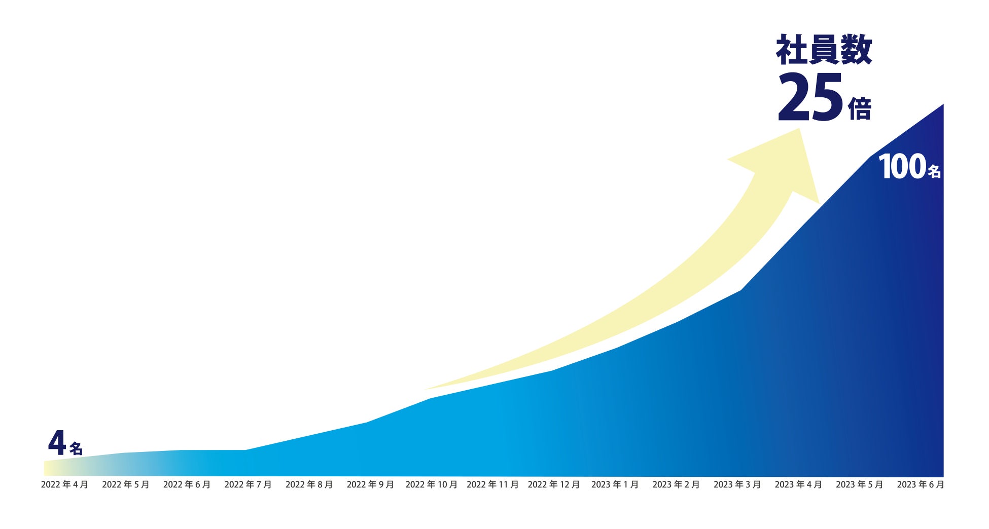 急速な事業成長に呼応し、社員数も増加しています。2022年4月の事業開始当初は4名でスタートしたところ、14カ月で25倍にあたる100名体制を実現しました。ニーズが急拡大しているEV充電インフラ業界において圧倒的No.1のシェアを獲得すべく、テラモーターズでは、2023年度末に300名体制を目指してまいります。