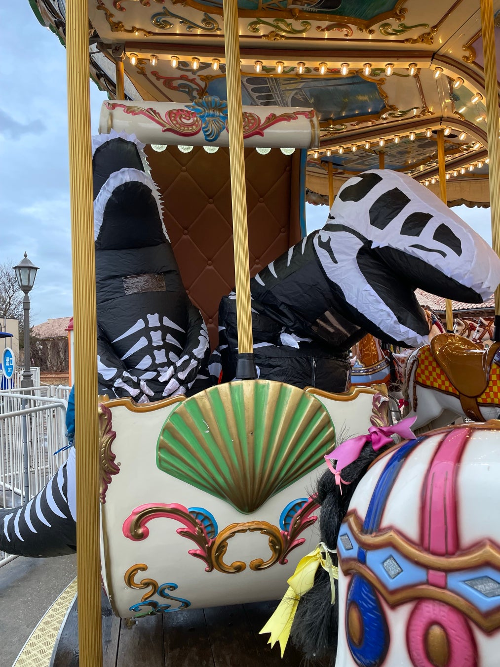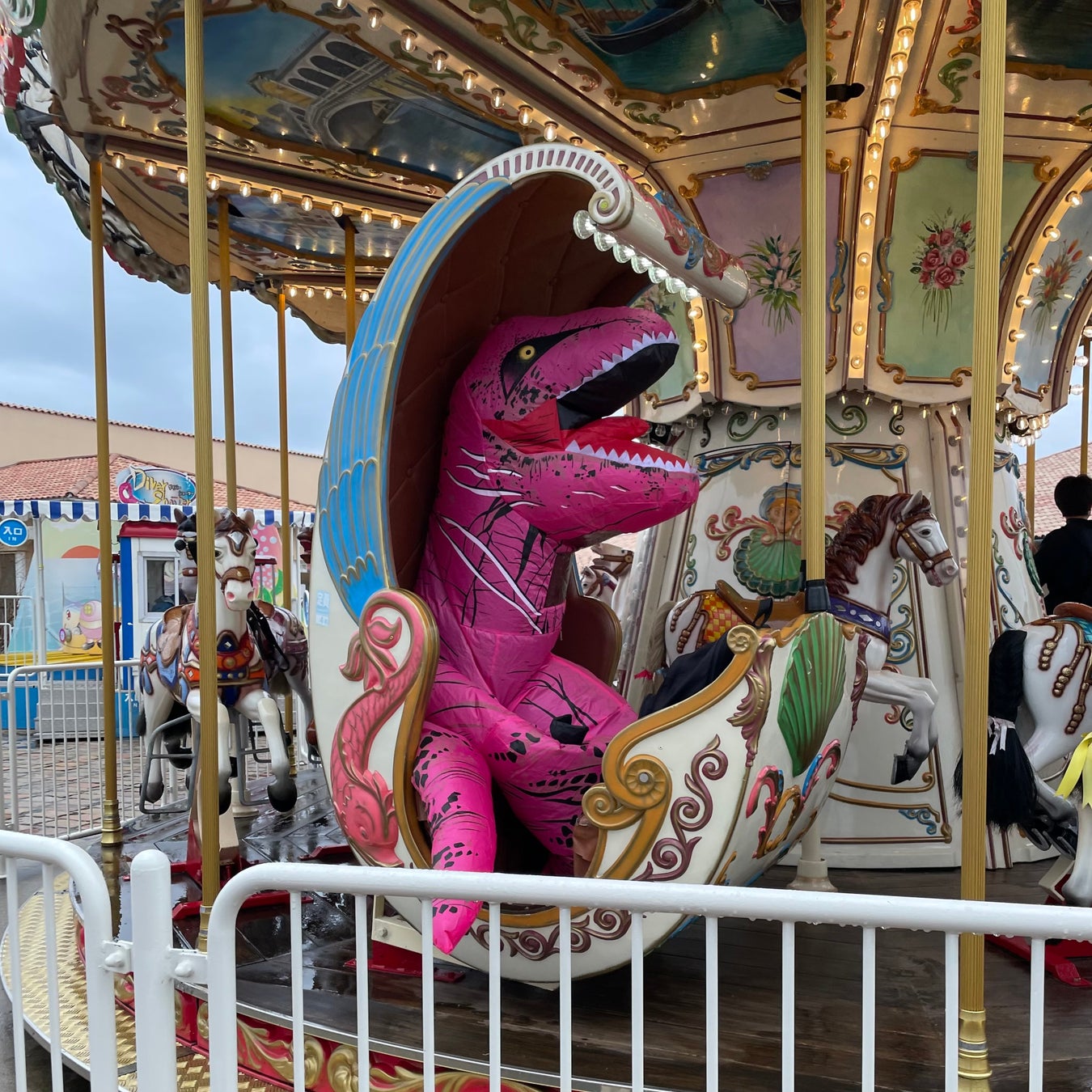 ティラノサウルスレースの後は、恐竜姿のままメリーゴーランドや観覧車に乗って、ソレイユの丘で思いっきり“ティラ活”しよう!