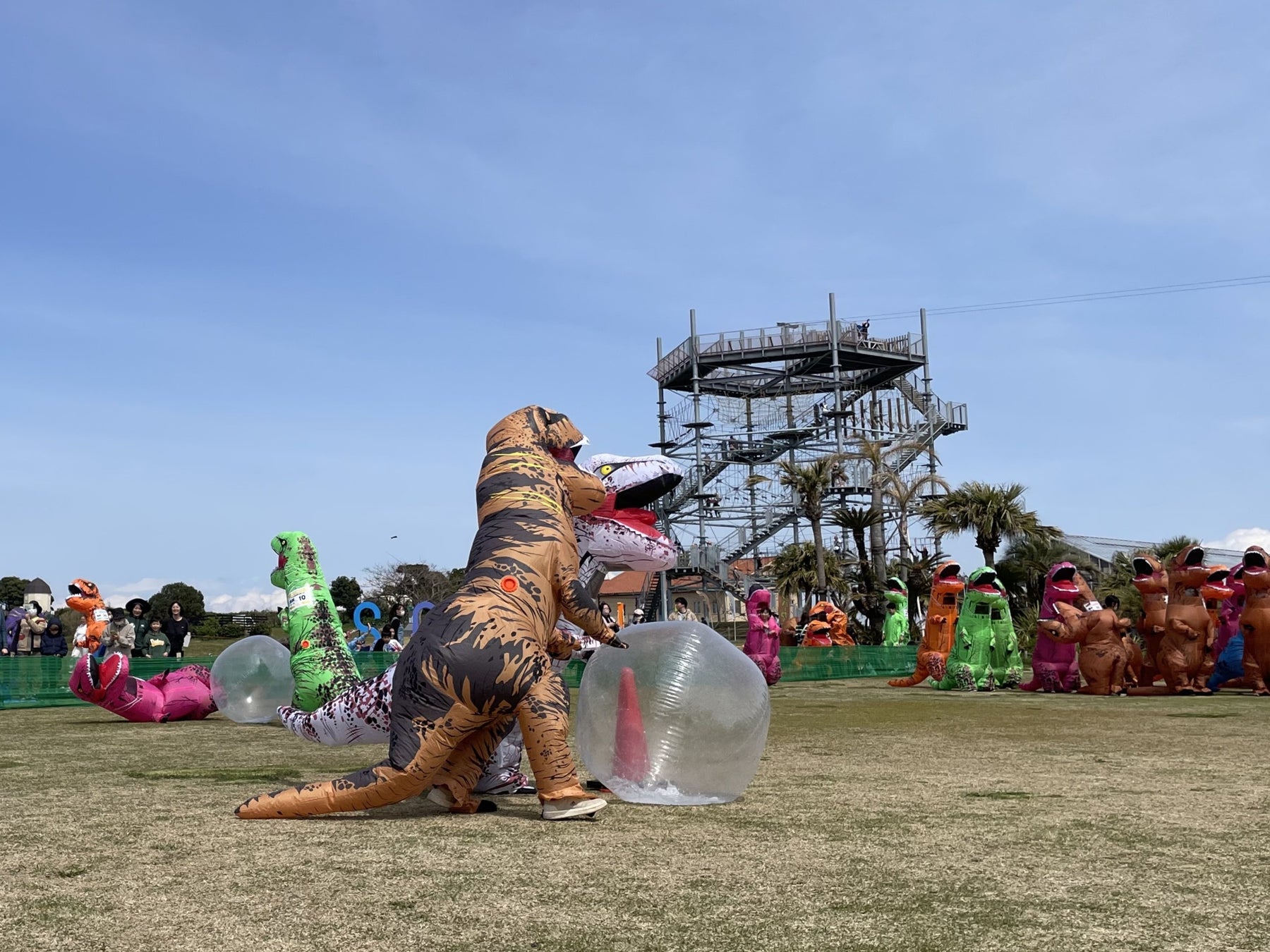 レース会場は、ソレイユの丘が誇る広大な芝生が魅力の「のんびりはらっぱ」。参加者は、恐竜の姿で柔らかな芝生の上を全力で駆け抜けるという、ここだけの爽快感を味わうことができます。