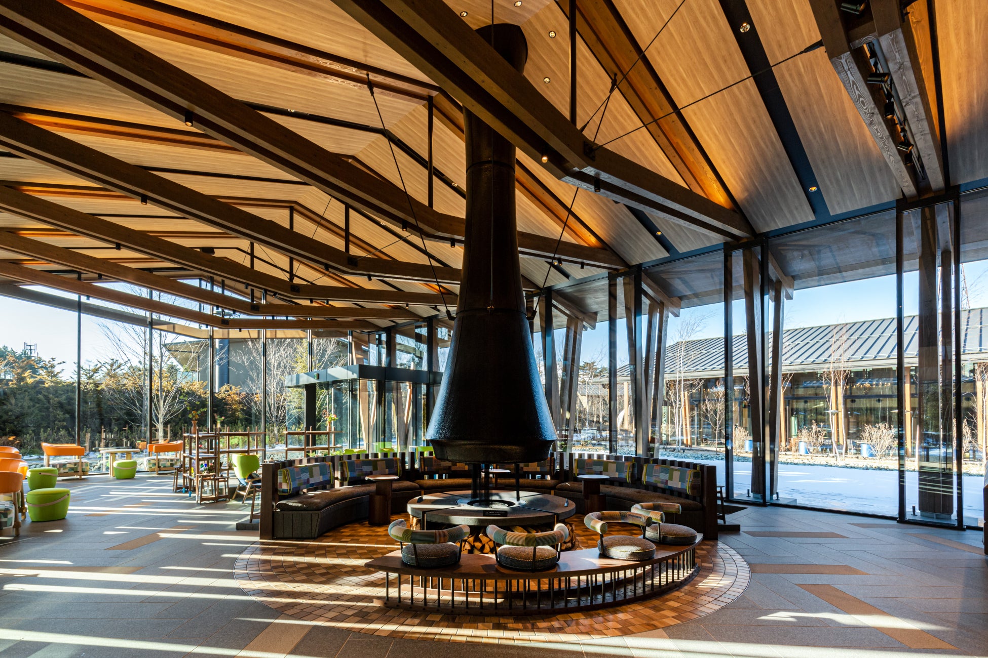 迫力と温もりを感じるホテルの建材には伐採期を迎えた地元木材(⾧野県産唐松)を使用するなど、地域経済の活性化とともに炭素放出量の低減にも貢献しています。