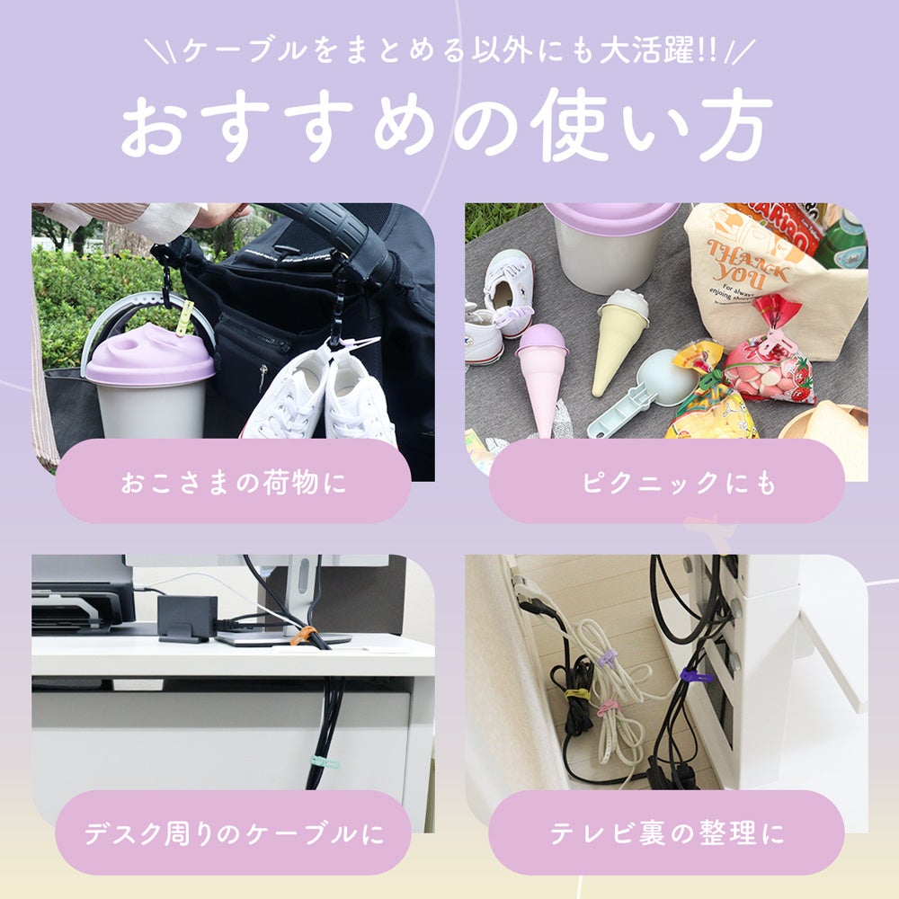 MOTTERUで人気のケーブルバンドに、新色が登場します。Lightningケーブルなどの充電ケーブル、ドライヤーやヘアアイロンのコード、パソコンの配線などをすっきりまとめることができます。また、パンやスナック菓子の袋を閉じたり、ビニール傘の目印にしたりなど、いろいろな使い方ができ、カラーバリエーションも豊富です。