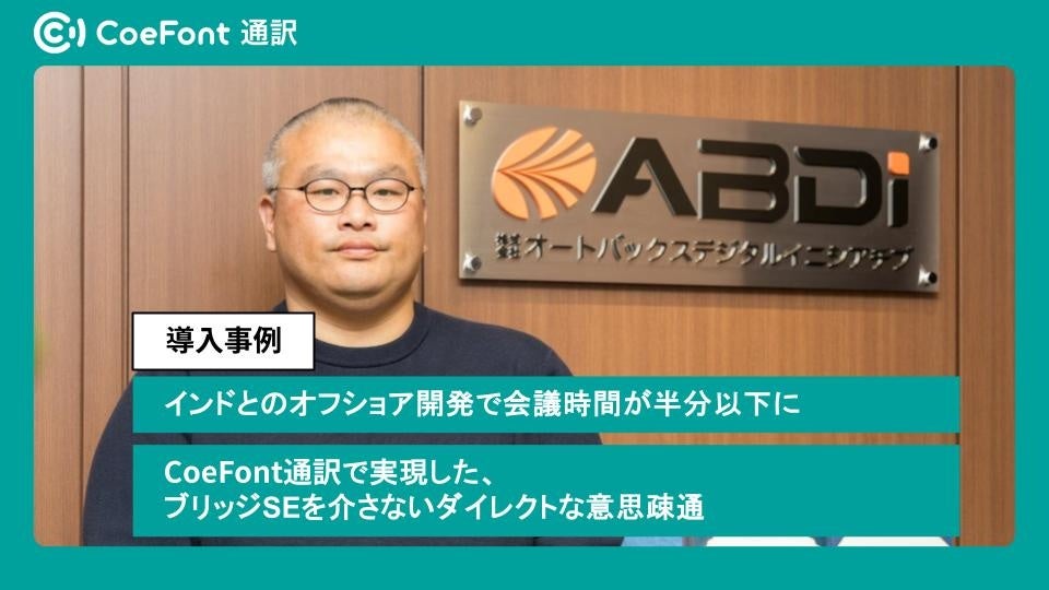 株式会社CoeFont(本社:東京都港区、代表取締役:早川 尚吾)は、オートバックスセブングループのIT・DXを担う株式会社オートバックスデジタルイニシアチブ(以下、ABDi)が、インドとのオフショア開発において多言語リアルタイム翻訳サービス「CoeFont通訳」を導入し、ブリッジSEを介さない直接的なコミュニケーションを実現した事例を公開しました。