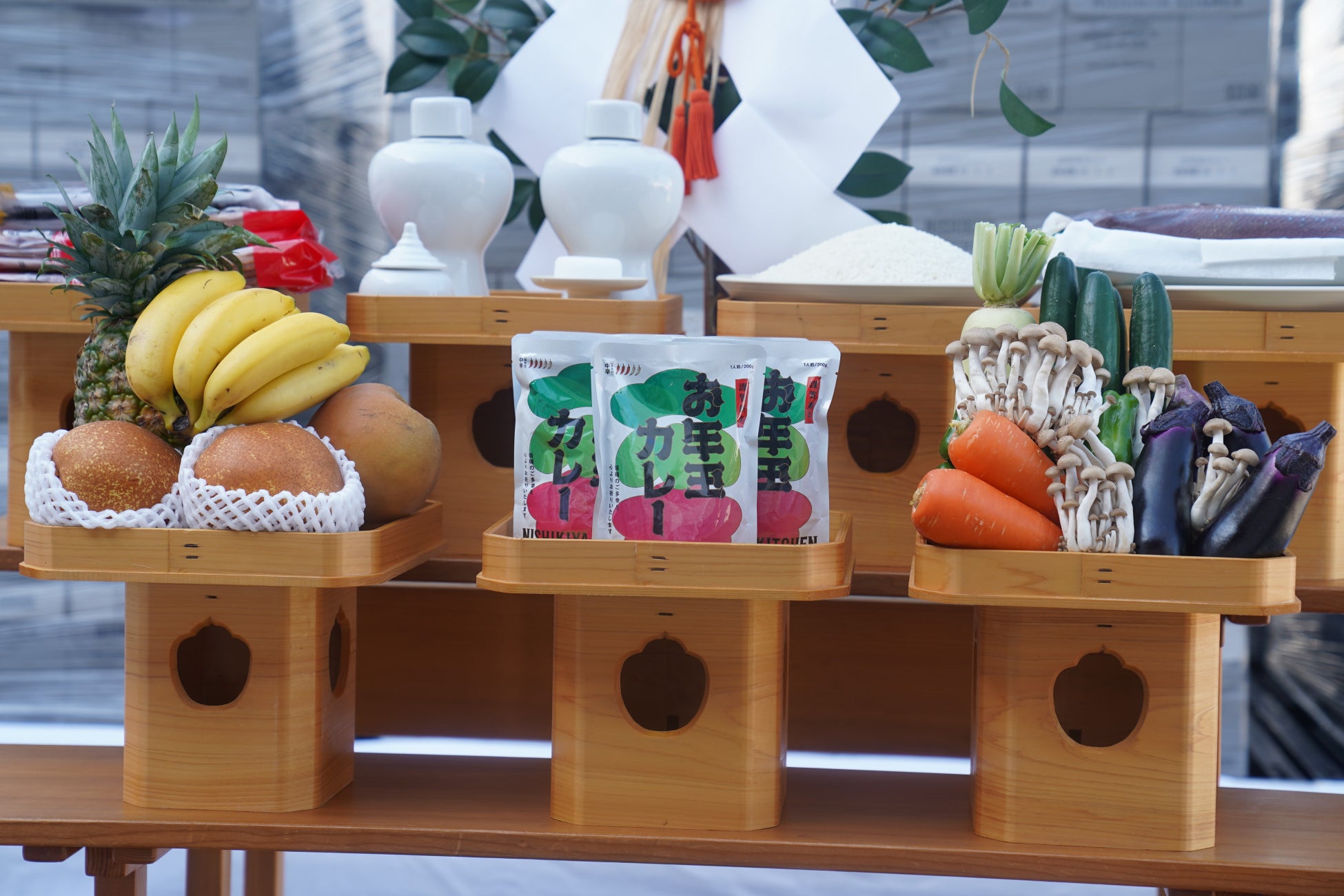 「良い年でありますように」と願いを込めて、毎年、地元・宮城県岩沼市にある神社の宮司様にご祈祷していただいています。縁起がいいとされる「大安」の日の午前中に、ニシキヤキッチンの本社近くの空港南工場敷地内でご祈祷していただきました。