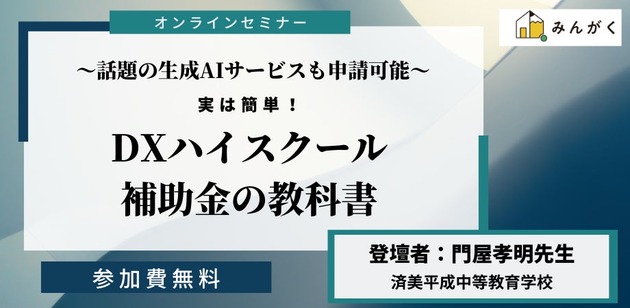 次年度の補助金獲得に向けて、申請から活用、その後の運用に至るまでの実践的なノウハウを学ぶことができるオンラインセミナーを開催します。本セミナーでは、補助金申請を成功させるための基本知識から、申請書作成のポイント、さらに採択後の具体的な運用方法まで、DXハイスクール補助金活用のプロフェッショナル、済美平成中等教育学校の門屋孝明教諭が分かりやすく解説いたします。