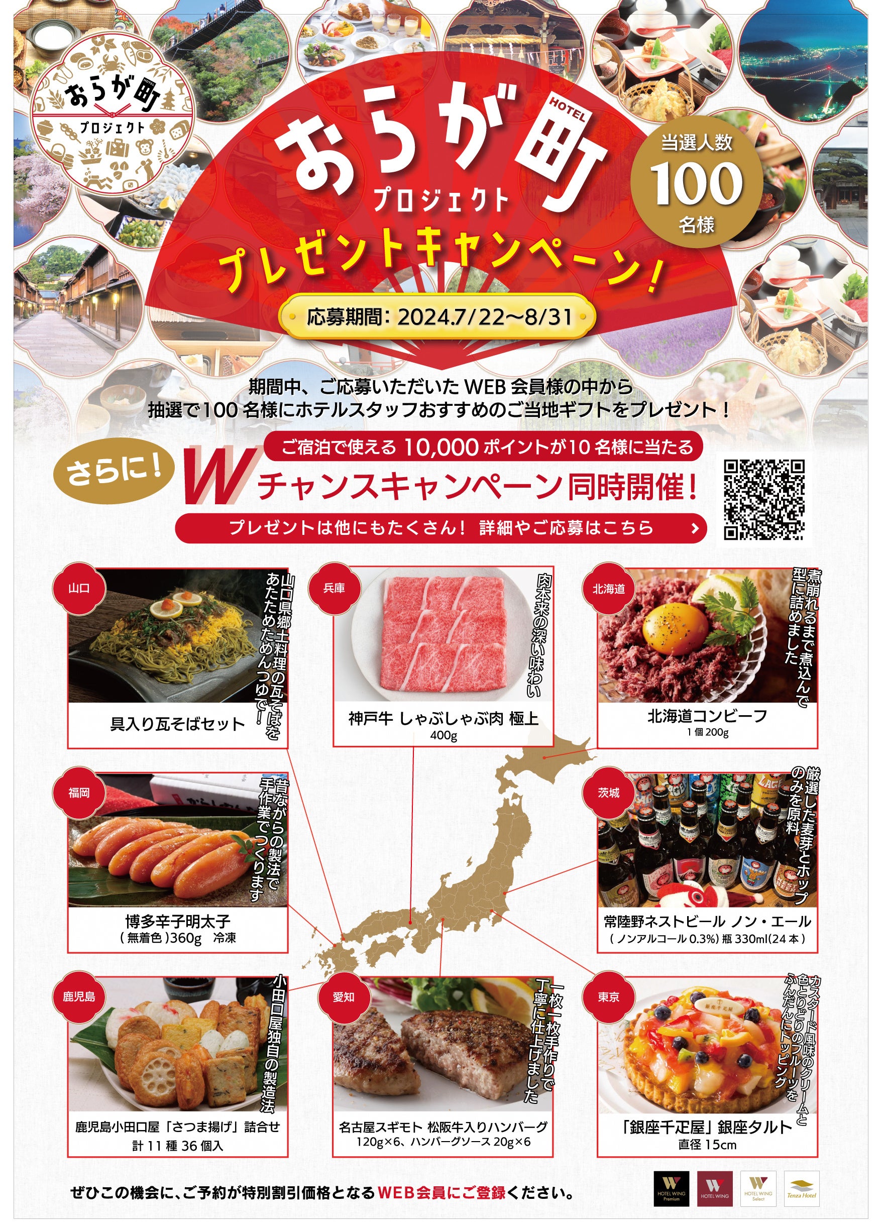 キャンペーン期間中、WEB会員登録のうえ、ご応募いただいた方の中から抽選で100名様にホテルスタッフおすすめのご当地グルメをプレゼントいたします。全国各地のホテルウィング・テンザホテル周辺の美味しいものを厳選しました。もらって嬉しい商品の数々です!