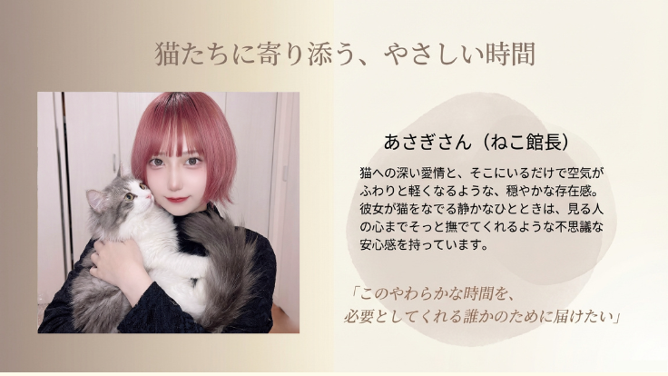 猫と過ごす穏やかな時間を通じて、ほっとできる居場所を届けていきたいです。」