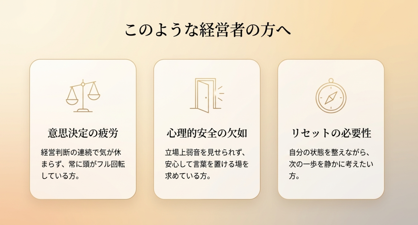 経営者が、日々の責任や緊張から少し距離を置き、自分自身の感覚や思考を整えるための時間を提供します。