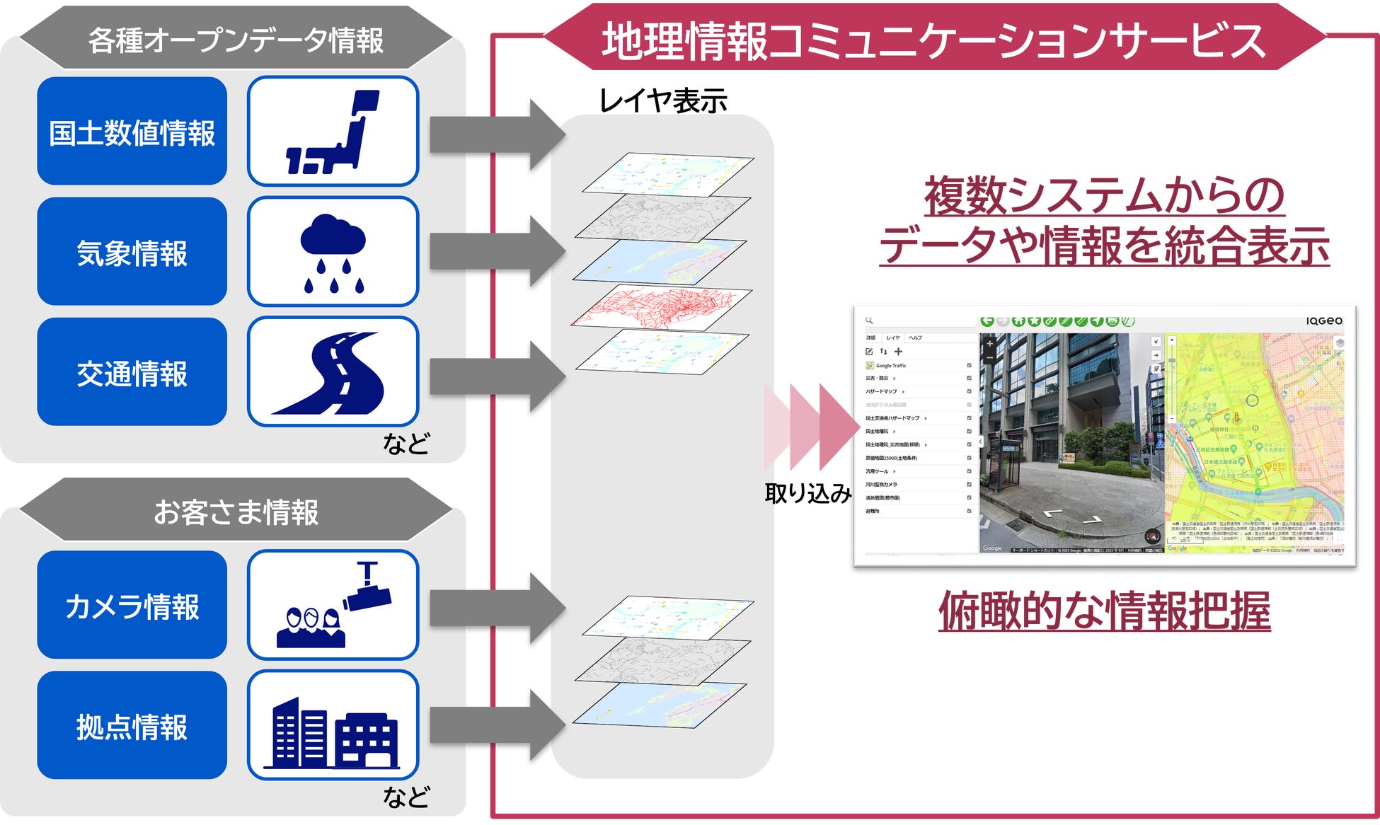 NECネッツエスアイがこのたび提供する「地理情報コミュニケーションサービス」では、お客さまが保有する拠点や設備の情報に加え、気象情報、交通情報、被災情報など各種web上で公開されているデータを地図上で統合表示し、利用者の用途に応じて自由に重ね合わせて確認することができます。