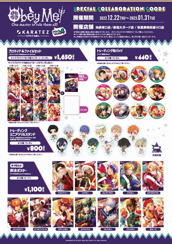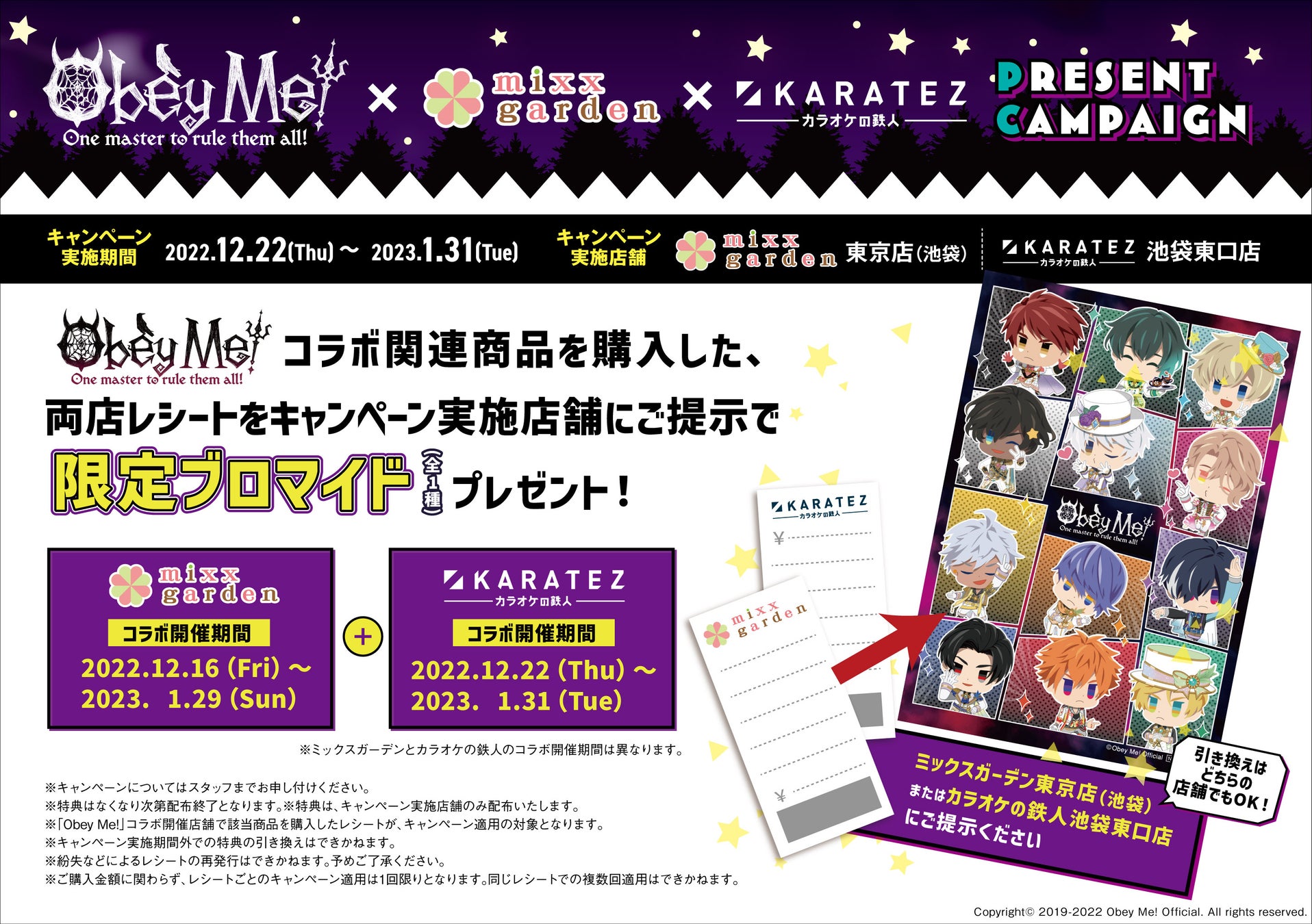 カラオケの鉄人と、mixx garden東京店(池袋)のコラボ実施店舗で、『Obey Me!』コラボ開催期間中に関連商品を購入いただいた際の発行レシートを、キャンペーン実施期間の2022年12月22日(木)~2023年1月31日(火)に、キャンペーン実施店舗の店頭でご提示いただくと、『Obey Me!』の限定ブロマイドをおひとつプレゼントするキャンペーンを実施します。