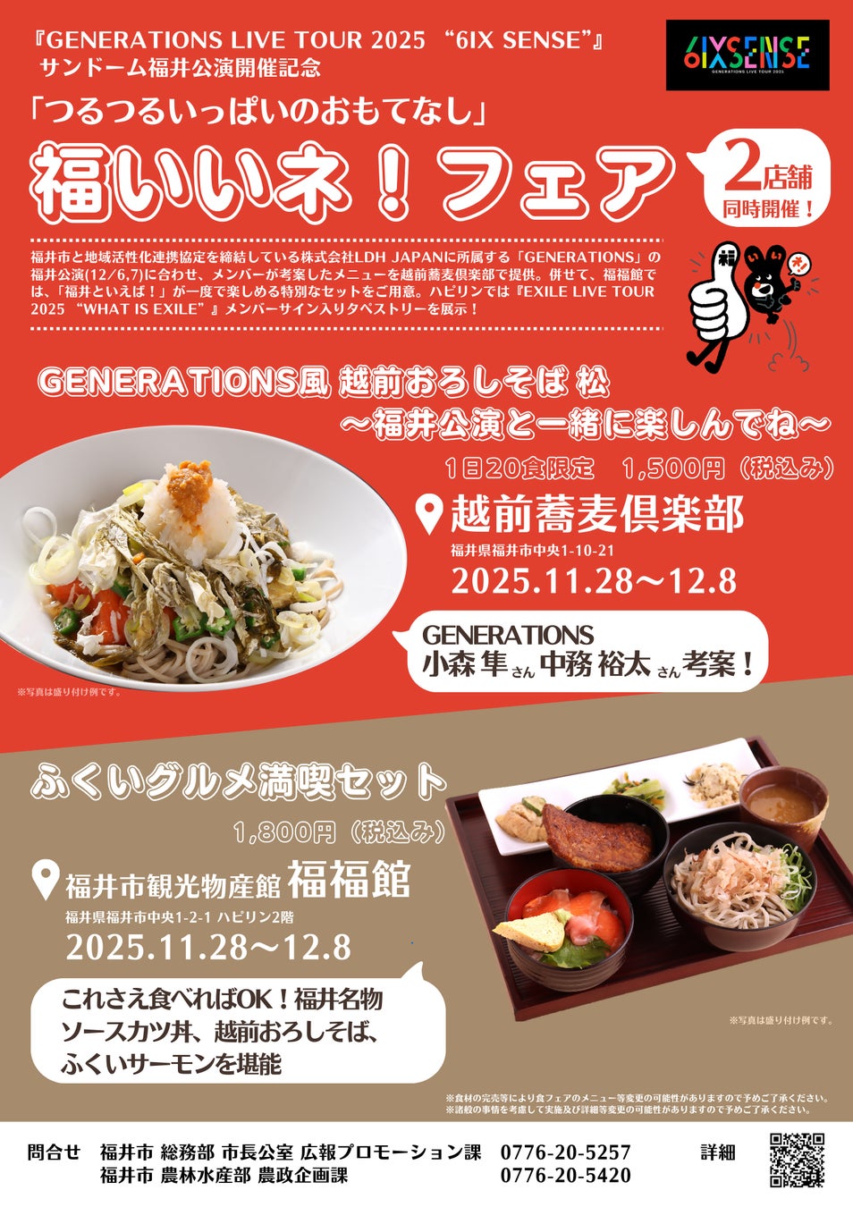 「GENERATIONS LIVE TOUR 2025 “6IX SENSE”」サンドーム福井公演(2025年12月6、7日)を記念した、福井の食の魅力が詰まった特別なフェアをお楽しみください。