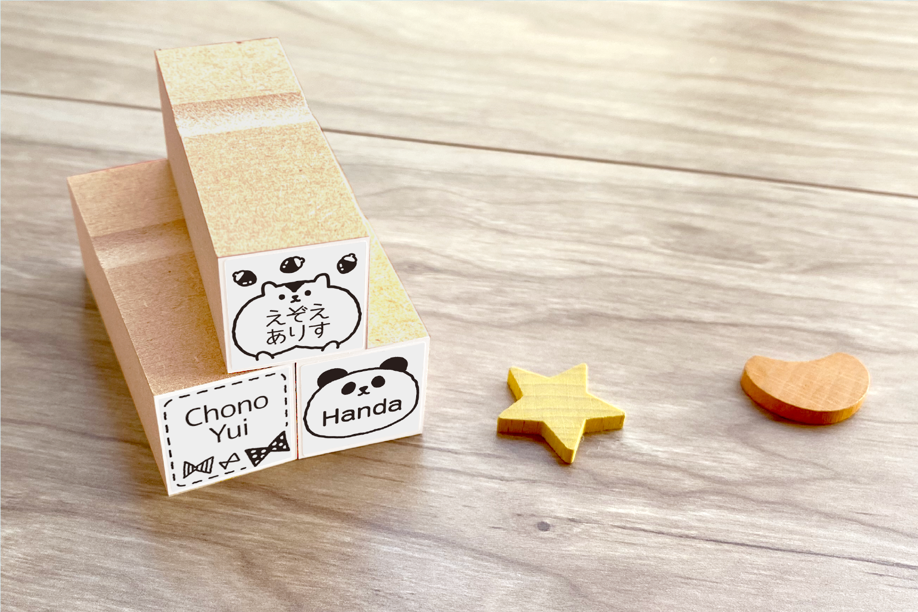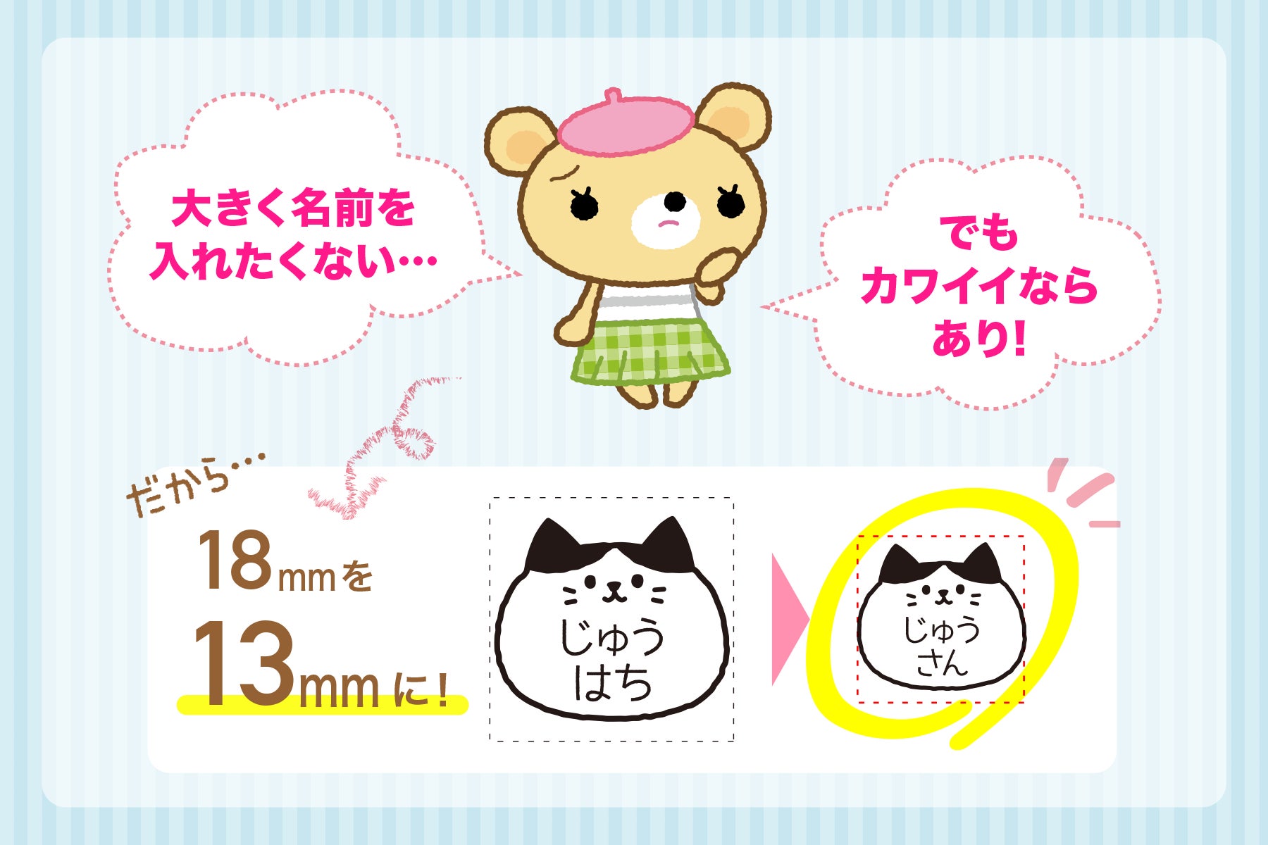 イラスト入りのままでは、小さくしすぎると大切なお名前が読みにくくなってしまいます。また、にじみにくい油性インク台を使用していますが、布に押した時の“にじみ”を考慮した上で、調整を重ねて13mmのサイズにたどり着きました。