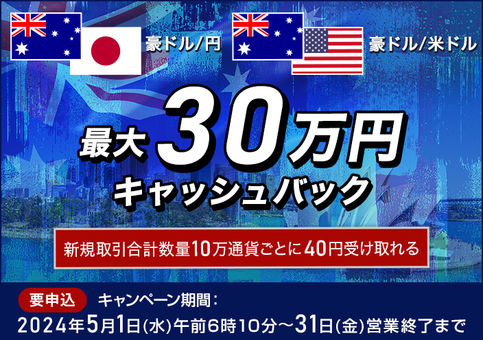 キャンペーンに申し込まれたお客さまに、期間中における豪ドル/円と豪ドル/米ドルの新規取引合計数量に応じて、最大300,000円をキャッシュバックします。