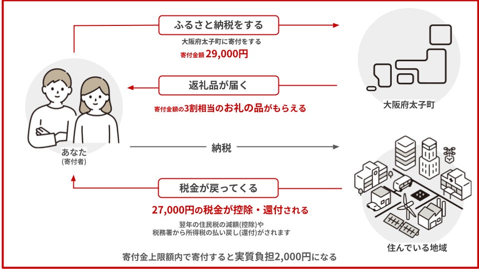 寄付金のうち2,000円を超える部分については、あなたが住む地域の住民税の減額(控除)や税務署から所得税の払い戻し(還付)を受けられます。