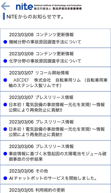 NITEではNITE AR-Shotだけでなく、Web上でもリコール情報を提供しております。