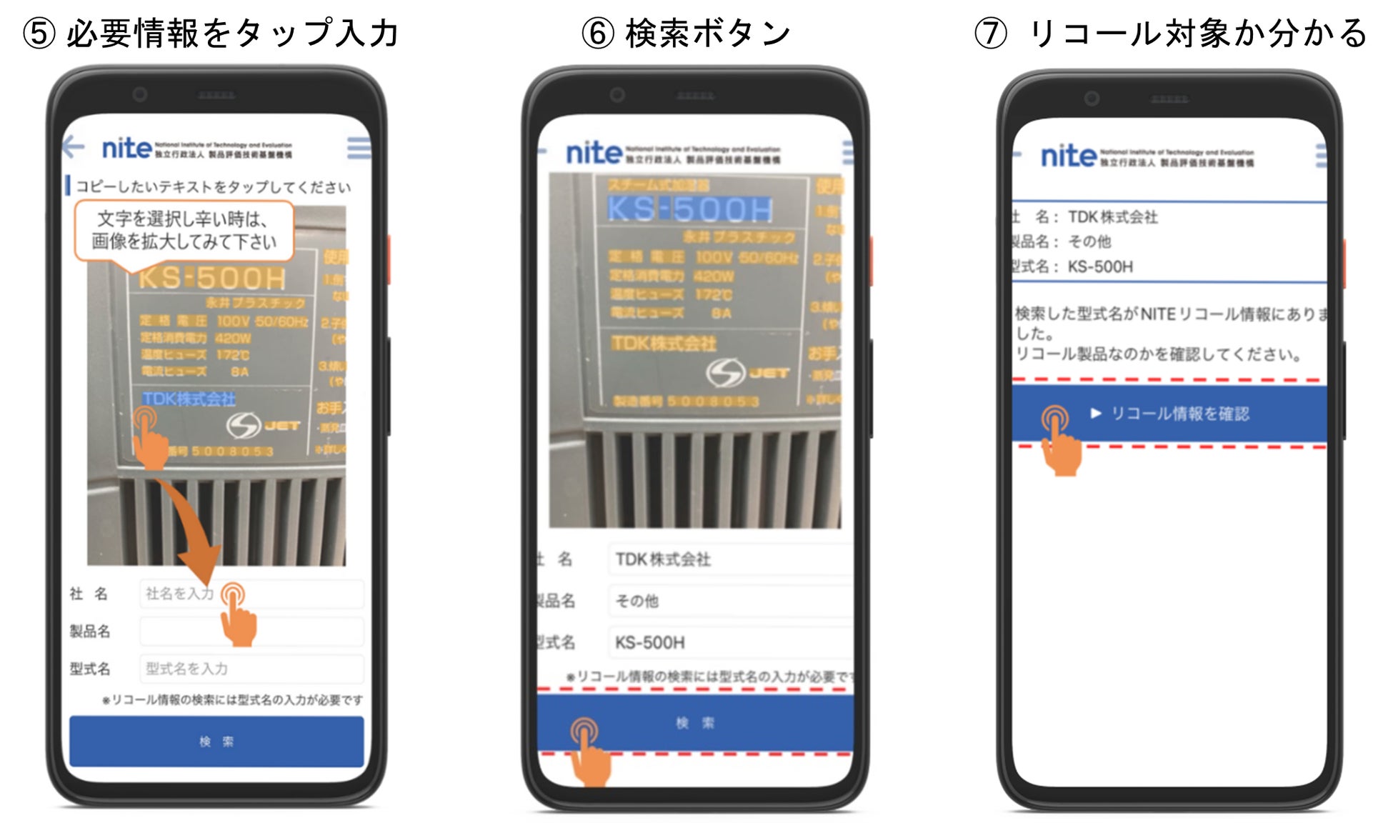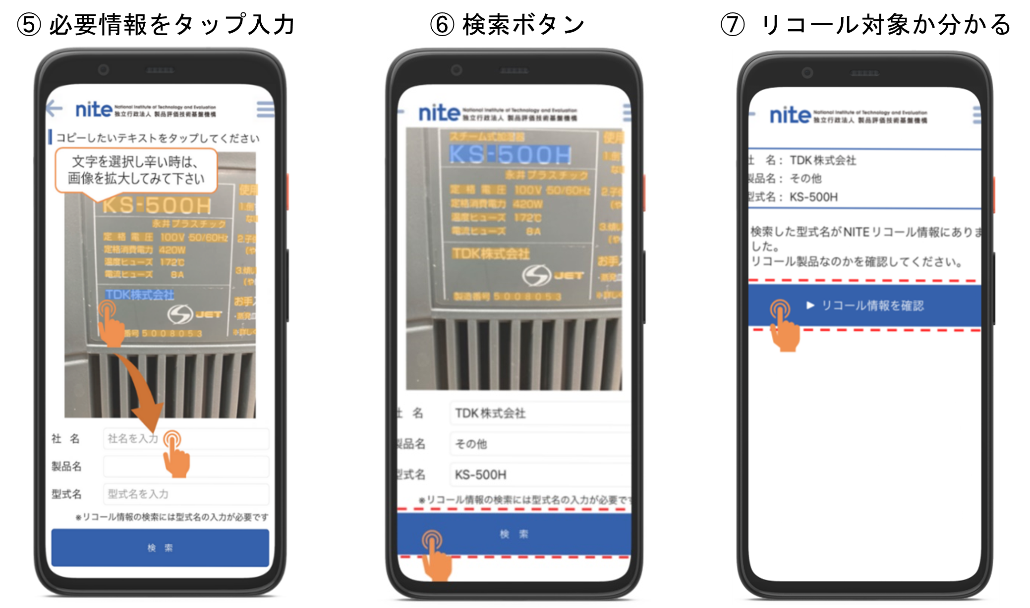 スマートフォンのカメラ機能を使って製品情報(銘板やラベル)に記載されている会社名や型式名などを読み取ることで、その製品がリコール対象かどうかが分かります。リコール対象製品の場合、リコールの内容と対処方法、問い合わせ先などの情報を得ることができます。