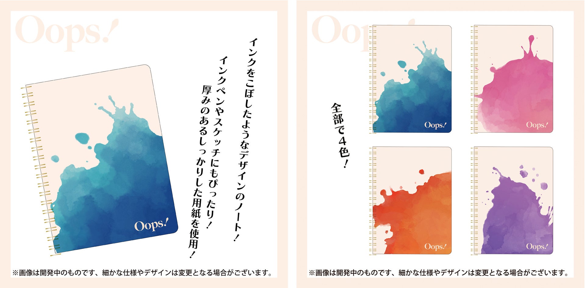 リングノート BL / PK / OR / PL (全4色) Oops! 各770円(税込)