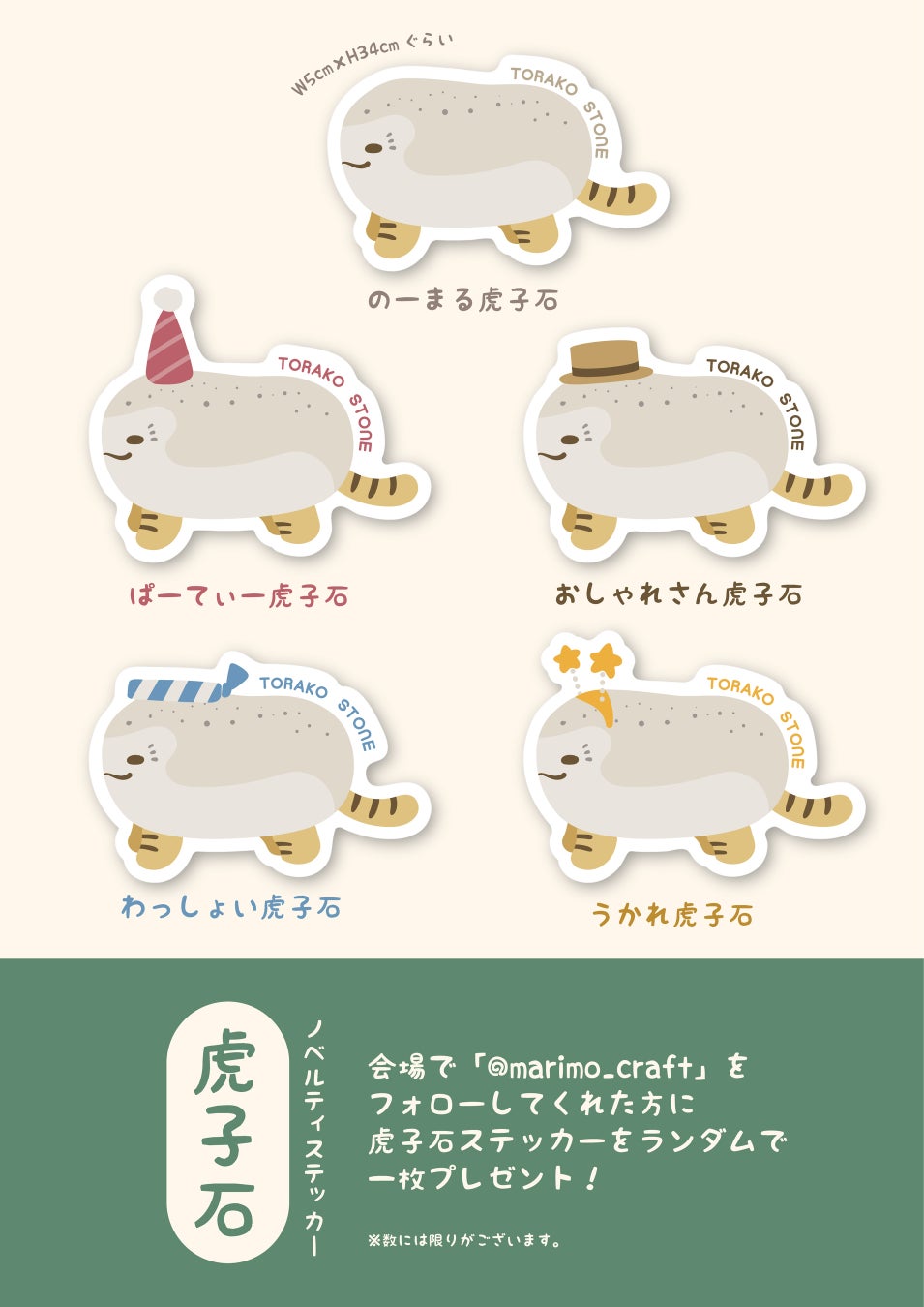 マリモクラフトの公式X(旧Twitter)アカウントをフォローしているお客様に、先着で「虎子石ノベルティステッカー」を一枚プレゼントいたします。絵柄は全部で5種類ご用意しており、ランダムで1枚のお渡しとなります。マリモクラフトのブースにご来場いただき、Xアカウントのフォロー画面をご提示ください。
