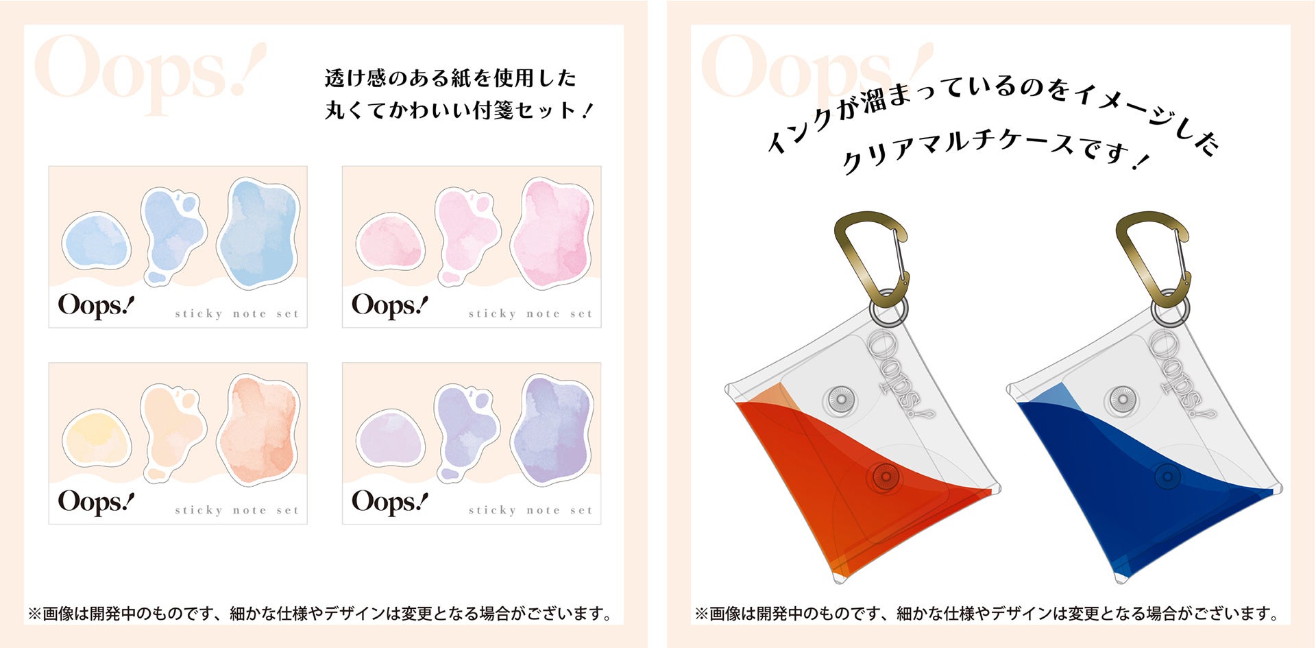インクをこぼして思わず漏れてしまった声「Oops!」をタイトルとした、マリモクラフトのオリジナルシリーズです。インクドロップに着想を得た、透明感のあるビビットなアイテムを揃えました。アクリルクリップ、リングノートなど、勉強やデスクワークで大活躍する文房具を中心に、クリアマルチケースSS、トートバッグなどおでかけに便利なアイテム、インク瓶をイメージしたかわいいキーホルダーを販売します。