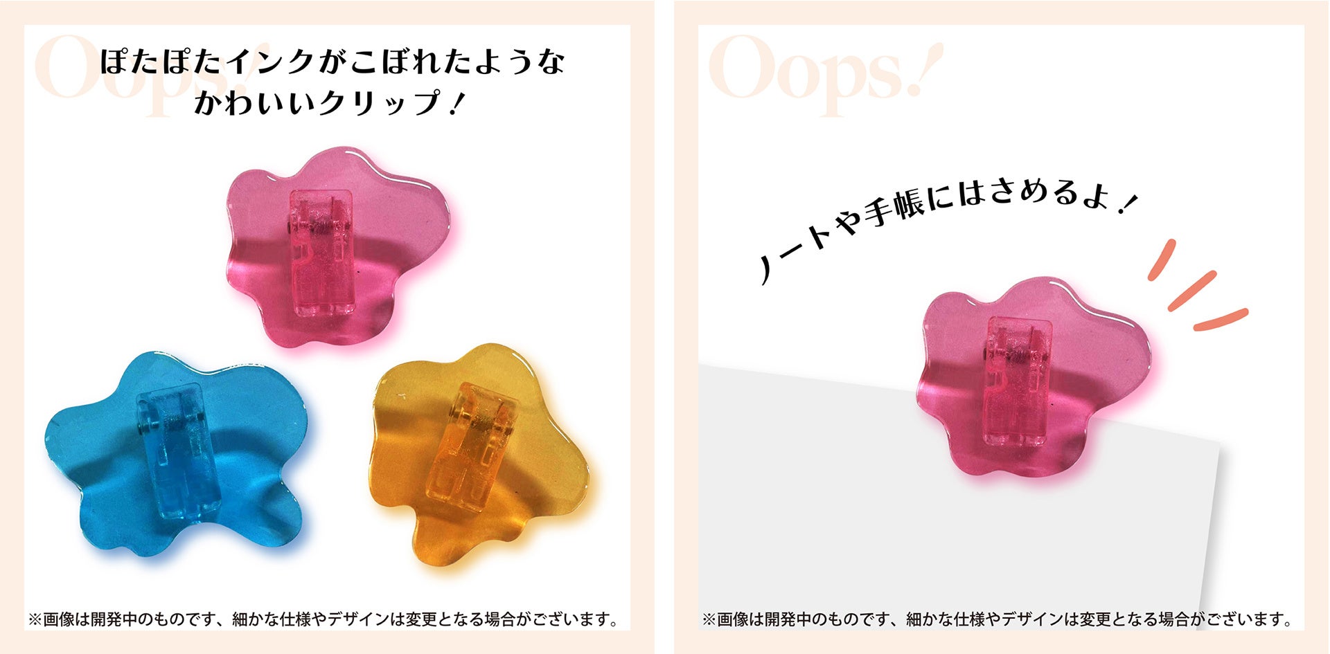 アクリルクリップ BL / PK / OR (全3色) Oops! 各550円(税込)